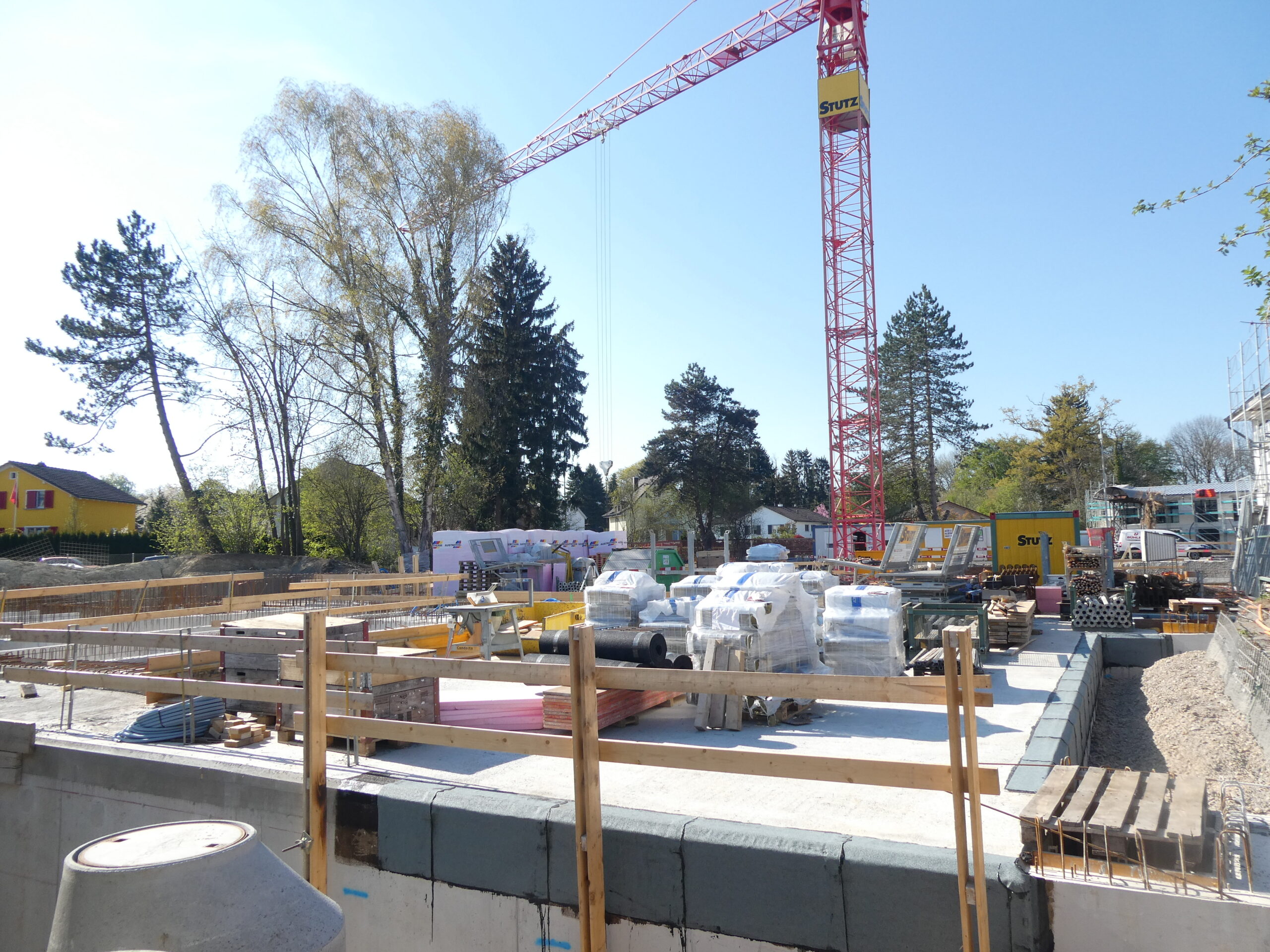 Auf der Baustelle wird fleissig gearbeitet und die Decke der Tiefgarage ist schon fast fertig. Das trockene Frühlingswetter kam den Arbeiten sicher entgegen. Wenn ich den Gestaltungsplan richtig angeschaut habe, sollte von meinem Standpunkt aus, die Sicht frei bleiben auf die 21 Eigentumswohnungen, die entstehen. Auch wenn ich etwas irritiert war, als da plötzlich ein Geländer stand. Mein Standpunkt ist auf den Plänen als Notfallzufahrt gekennzeichnet und sollte selbstverständlich frei bleiben.