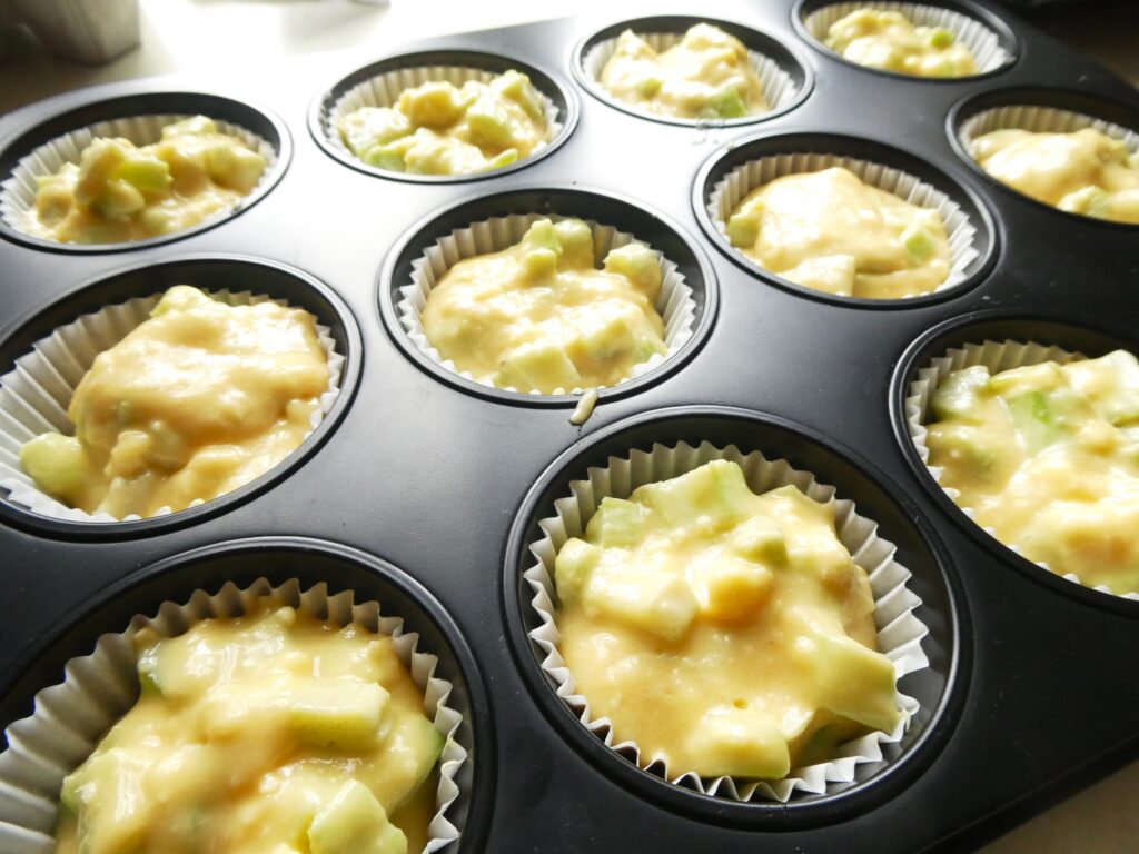 Aus den Zutaten einen Rührteig zubereiten, eine Muffinform mit Papier auslegen und den Teig darin verteilen.