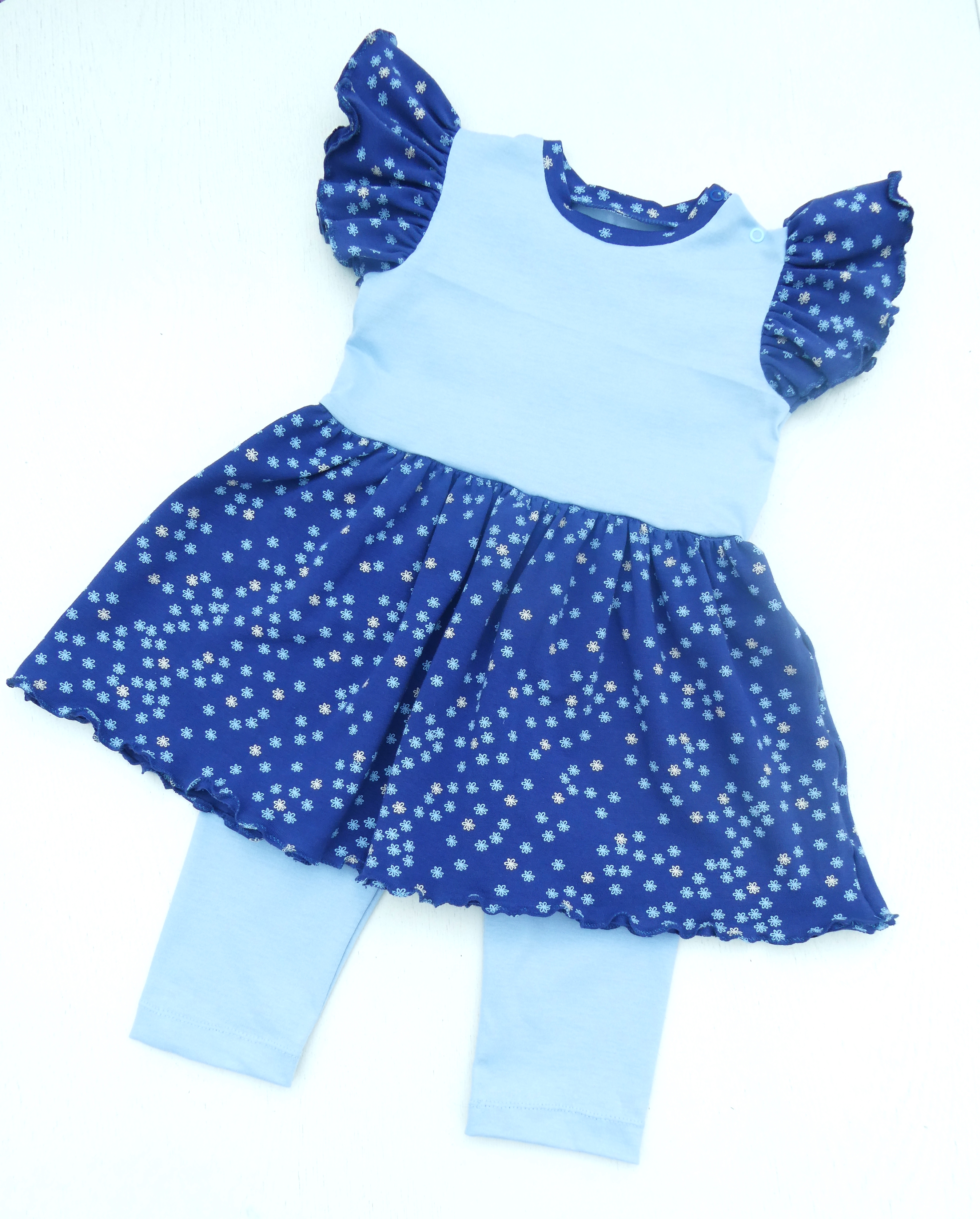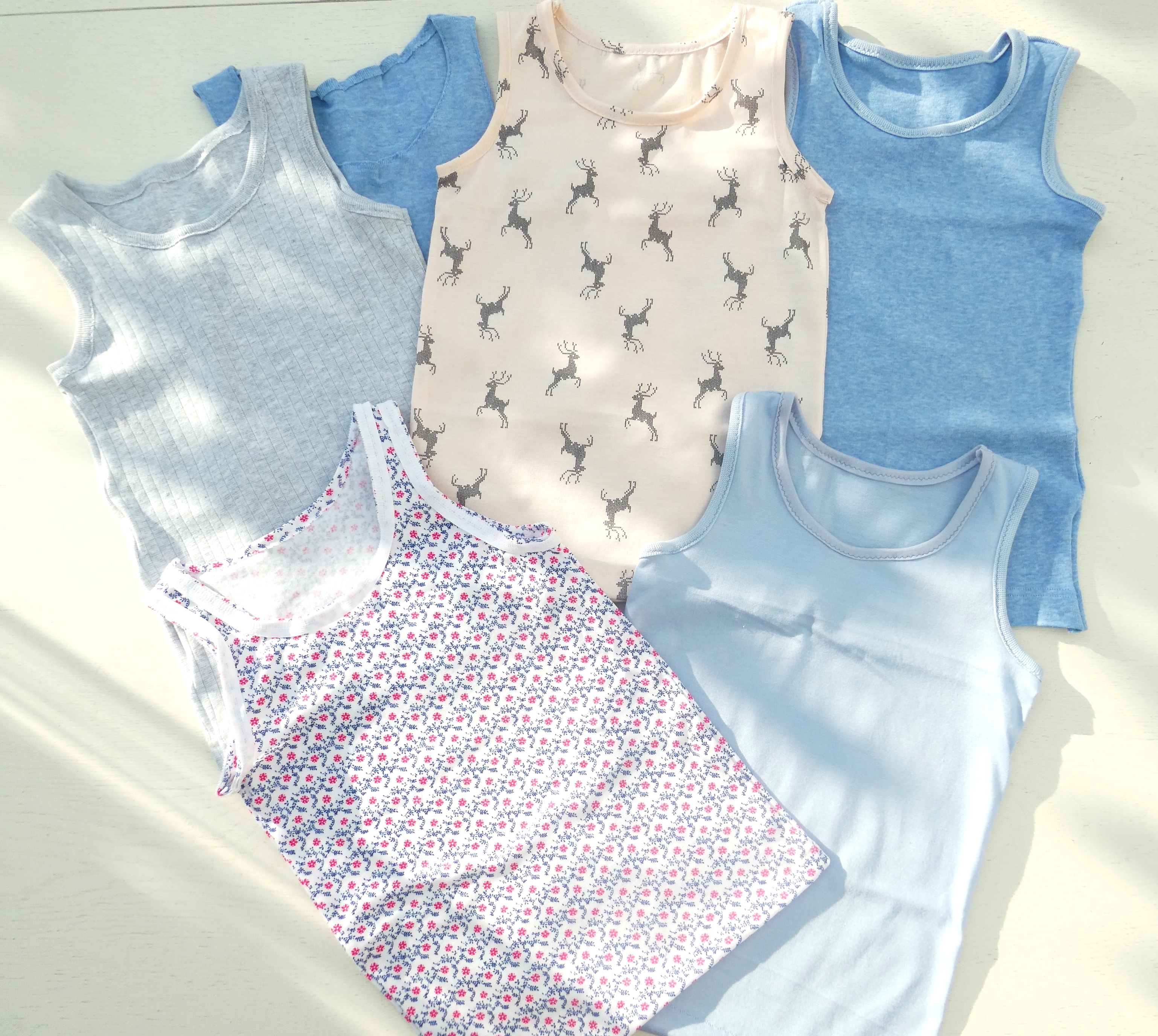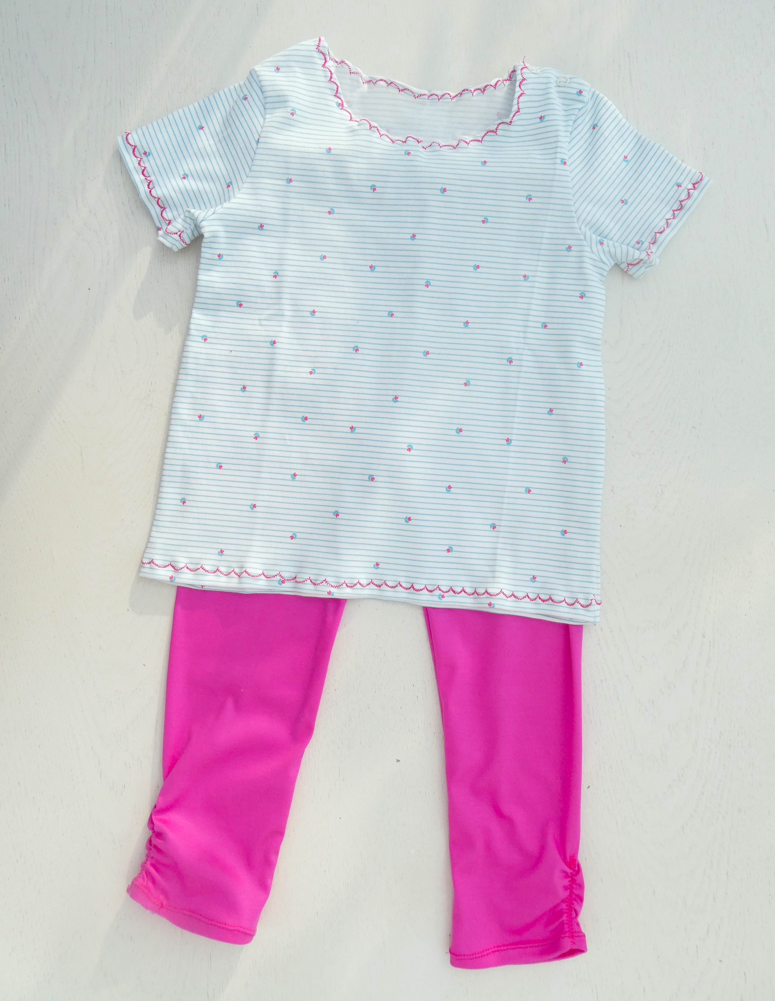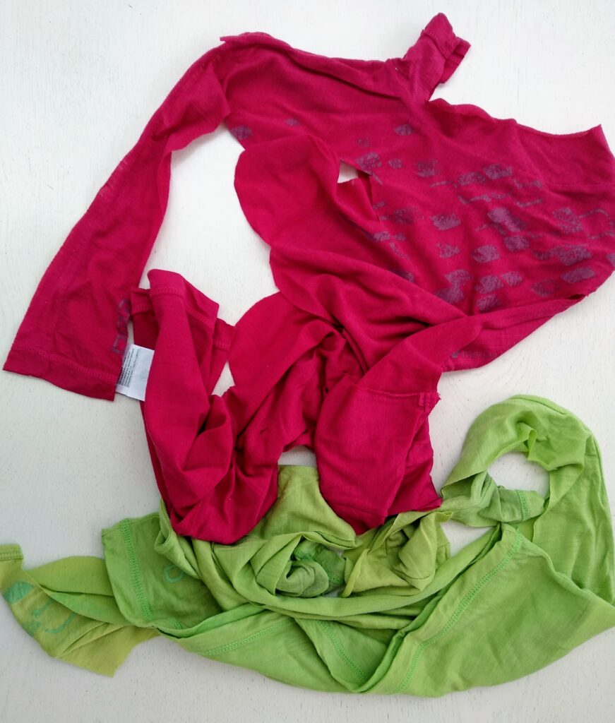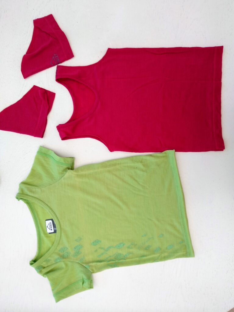 Bei mir lagen schon länger zwei ausgemusterte T-Shirts von der Mama unserer Enkelin. Der Stoff aus Merino soll sehr angenehm zum Tragen sein. Warum sollte die Enkelin also auf den Tragekomfort verzichten? Ich probierte die Gebrauchspuren und die ersten kleinen Löcher zu umgehen beim Zuschneiden. Da ich neuerdings Unterleibchen nähe für den kleinen Schatz, schnitt ich aus jedem Shirt ein kleines Leibchen zu.