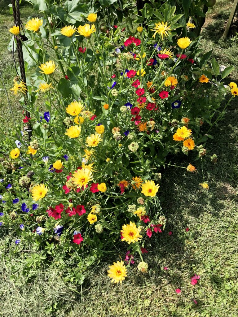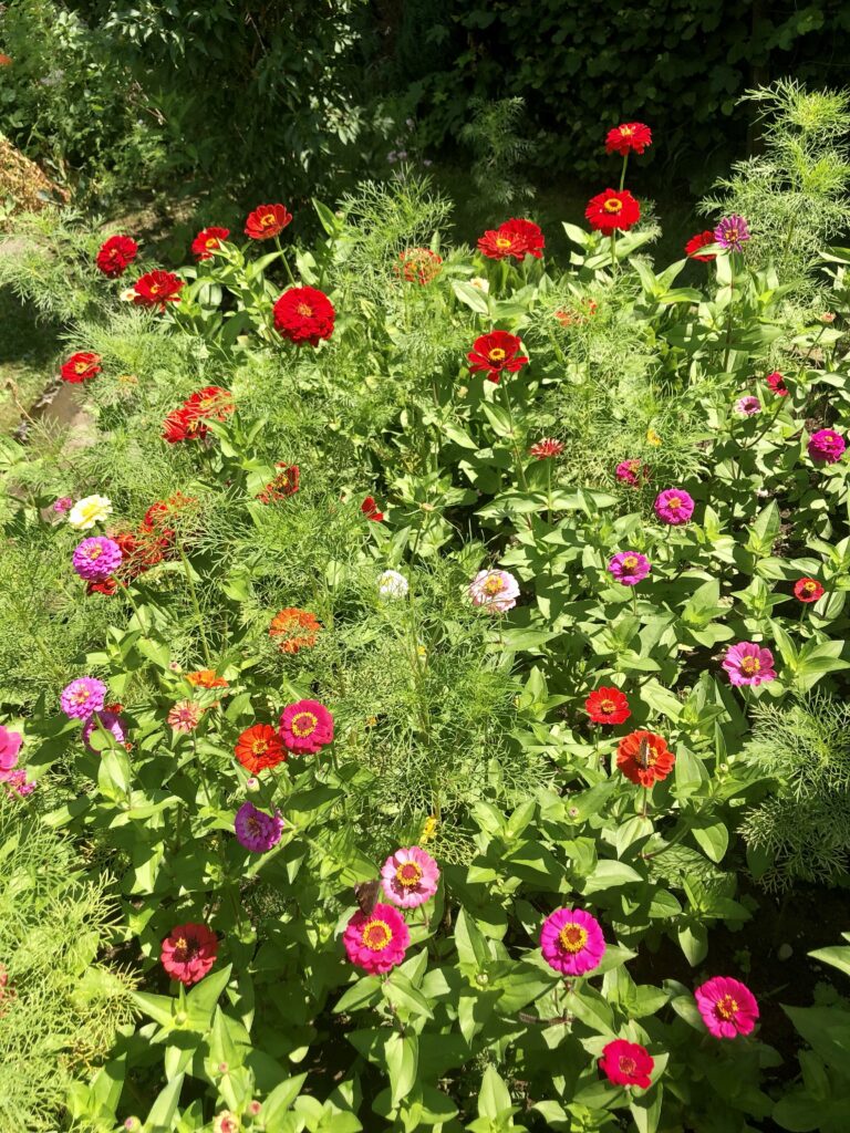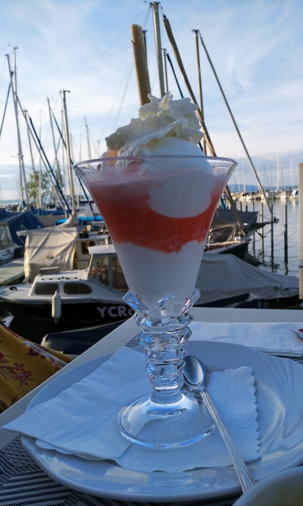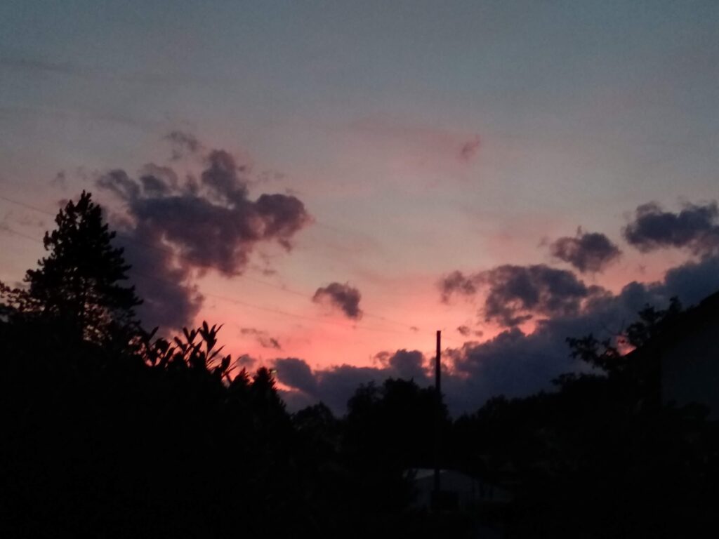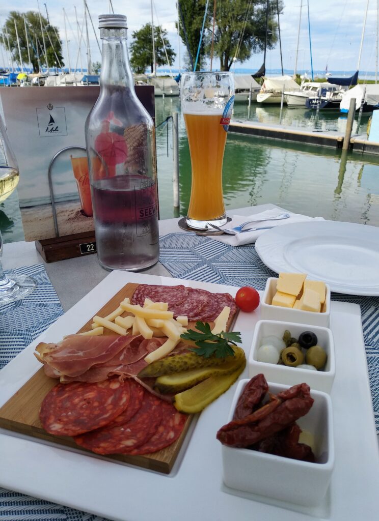 Laut Meteorologen ist es der heisseste Juli seit Messbeginn – kommt mir langsam vor, als ob ich das bald für jeden neuen Monat schreiben muss. Zum Glück gab es aber doch ein paar kühle Nächte, sodass man das Haus kühl halten konnte. Die Regenmenge war sehr gering und so musste man den Garten fleissig giessen. Ab und zu sieht man einen Schmetterling bei uns im Garten, das Taubenschwänzchen kommt sogar regelmässig vorbei. Ich besuchte die Tanzaufführung „Amazonia“ meiner Tochter. Zu den eindrücklichen Fotografien des Amazonasgebiet von Sebastião Salgado und den eigens für diese Aufführung komponiert Flötenklängen von Andreas Stahel tanzten die Schüler eine sehr unterhaltsame, eindrückliche und sehr stimmige Aufführung, die mir sehr gut gefallen hat. Wenn man jetzt mit dem Velo unterwegs ist, kann man an wunderschönen Blumenwiesen und Sonnenblumenfelder vorbeifahren. Inspiriert von Nanni, habe ich versucht Zucchini, von denen es zurzeit mehr als genug gibt, zu fermentieren. Von dem Resultat bin ich noch nicht so überzeugt. An den warmen Tagen mache ich vorwiegend sommerliche Salate mit frischen Zutaten aus dem eigenen Garten, denn zum Kochen ist es einfach zu heiss. Einen wunderbaren Sommerstrauss habe ich von meiner Tochter erhalten, und einen zweiten von meinem Mann aus dem Garten. Der Sturm hat nicht nur unseren Ampelschirm geknickt, sondern auch einige schöne Blumen. Das Sonnenuntergansfoto ist von einer Abendfahrt auf dem See.