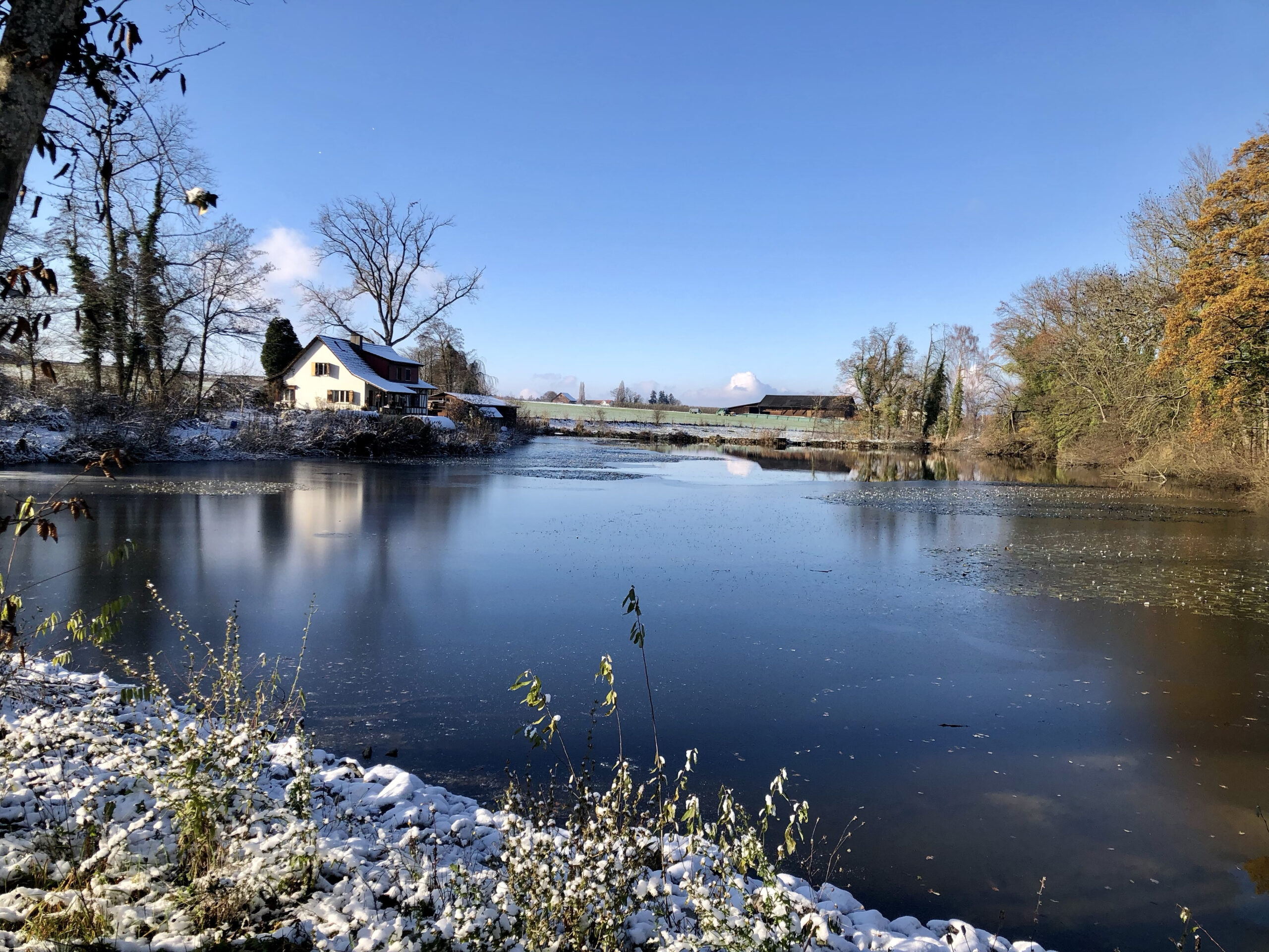 Der Spaziergang führte am Weiher vorbei. Trotz der Kälte geht es wohl noch länger, bis sich eine tragbare Eisschicht bildet.