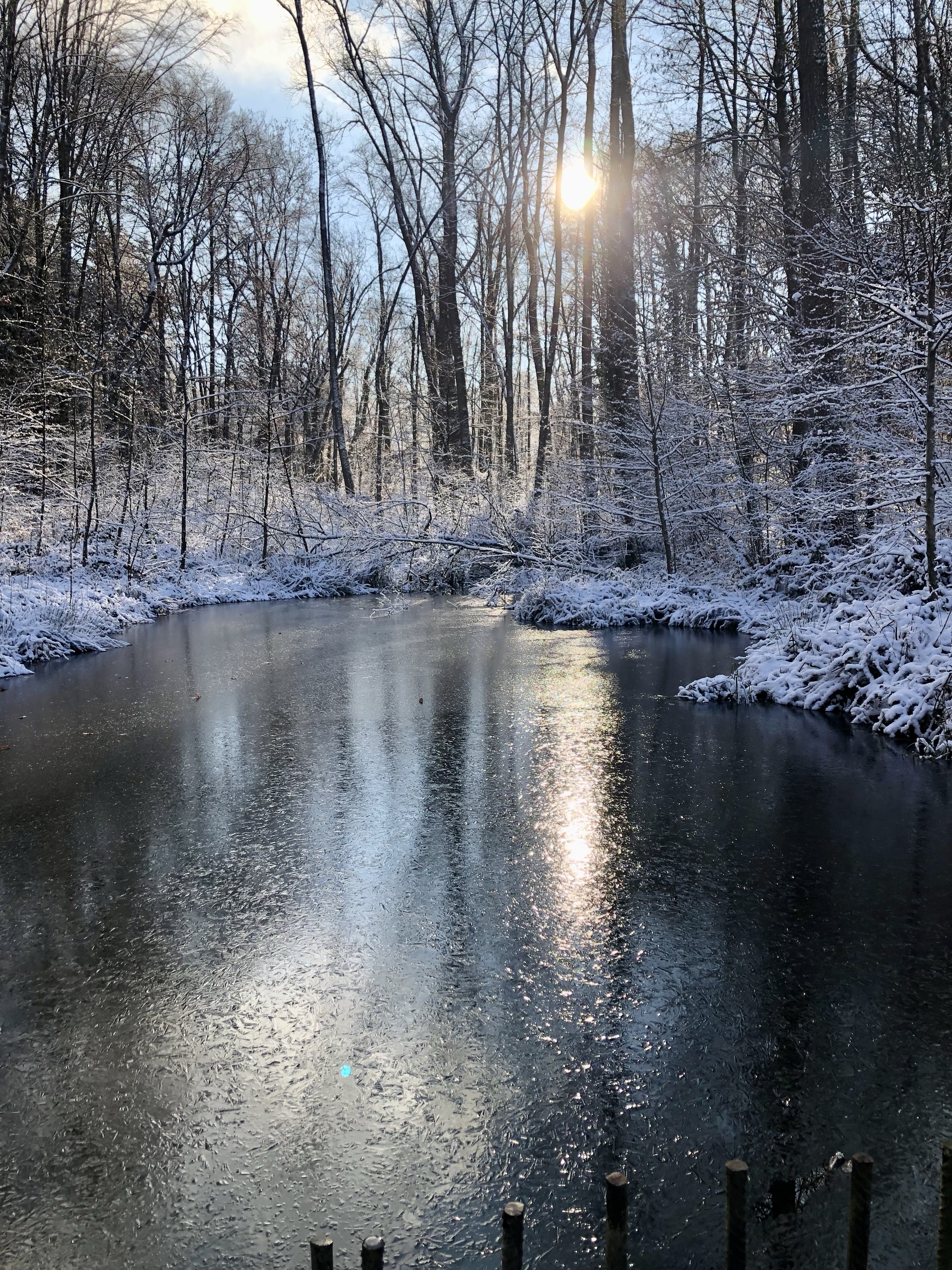 Bei den kleinen Weiher bildete sich eine ganz dünne Eisschicht und die Sonnenstrahlen glitzerten wunderschön darauf.