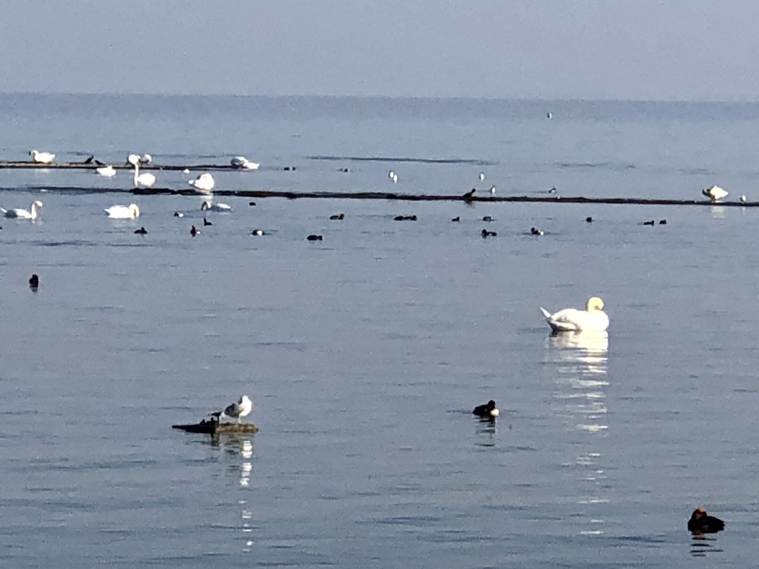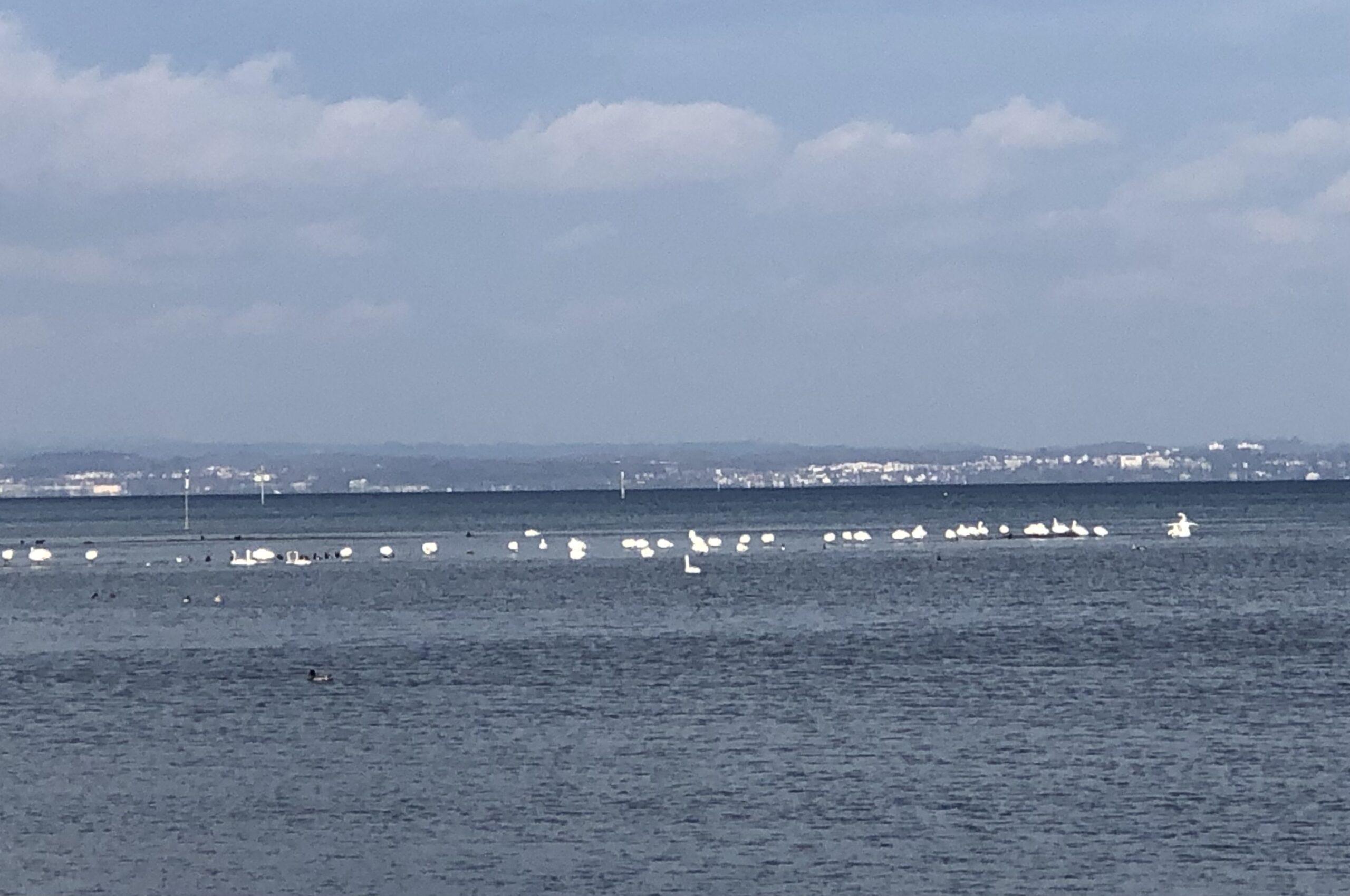 Auf den Kiesbänken weit draussen im See sitzen die Schwäne und geniessen die Sonne. Bei normalem Wasserstand sieht man die Kiesbänke nicht. Ich hoffe, dass die Nebeltage bald vorbei sind und der Frühling Einzug hält.