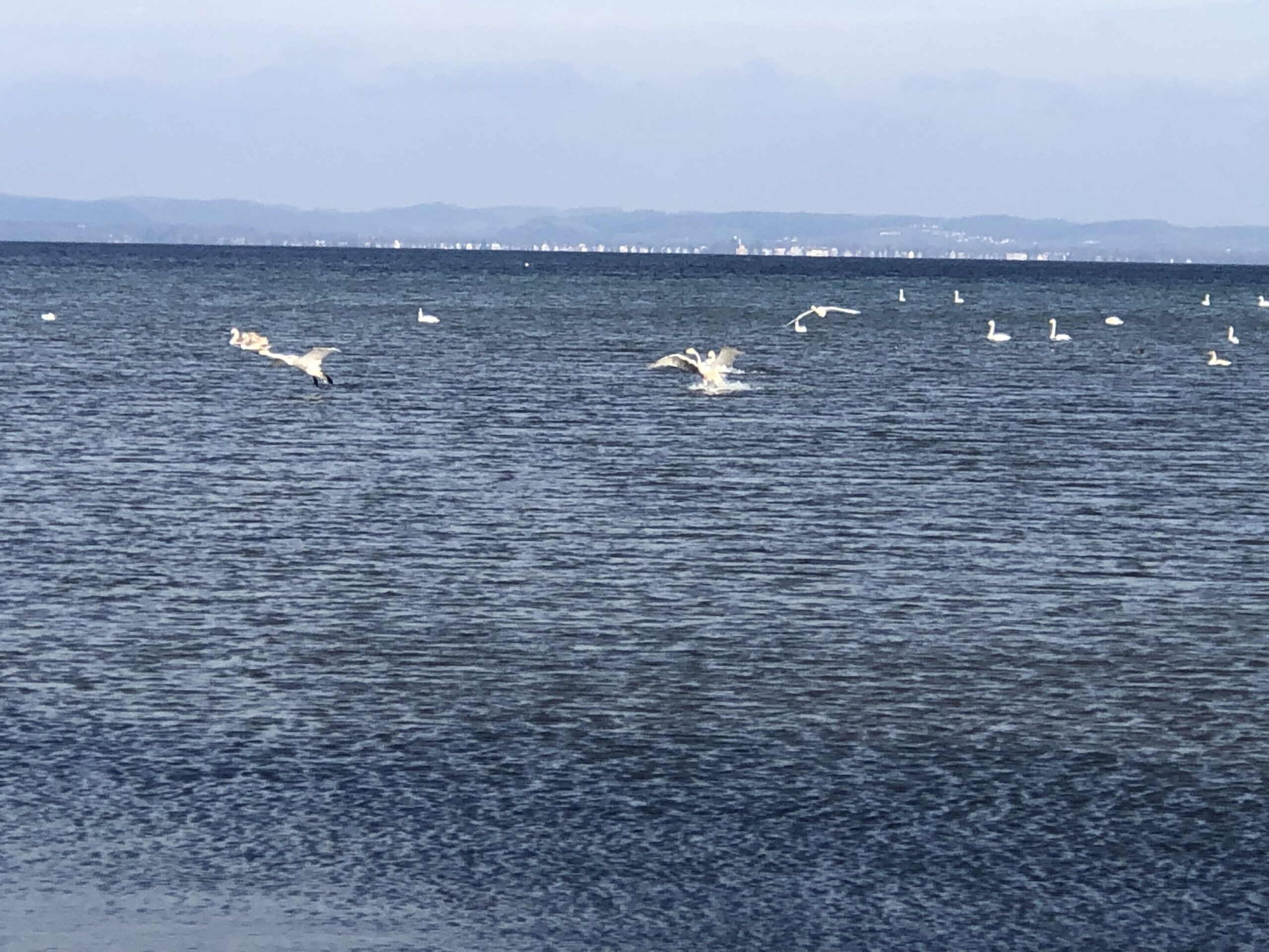 Die Schwäne fangen an zu balzen und manchmal starten sie alle miteinander und fliegen davon. Ist leider ganz schwierig zu fotografieren, aber zum Zuschauer unterhaltsam.
