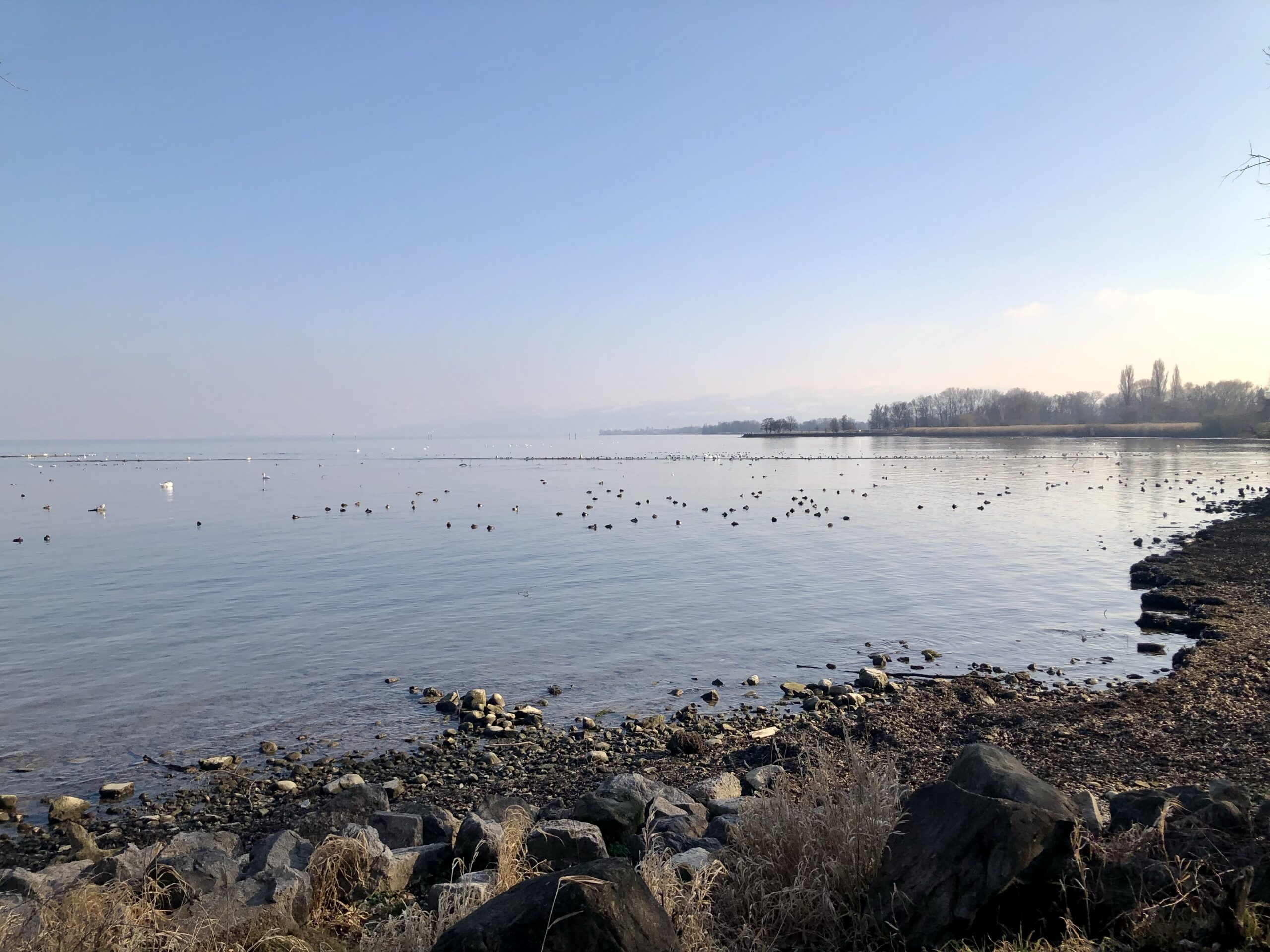 Auf meinem heutigen Spaziergang nehme ich euch mit an den See. Der Wasserstand ist sehr tief, aber über den Winter sieht man sehr viele Wasservögel in der geschützten Bucht. Weil noch fast keine Boote auf dem See sind, haben sie da ihre Ruhe. Auch ich verweile da sehr gerne, mit Blick in die Ferne, wo der See mit dem Horizont verschmilzt.