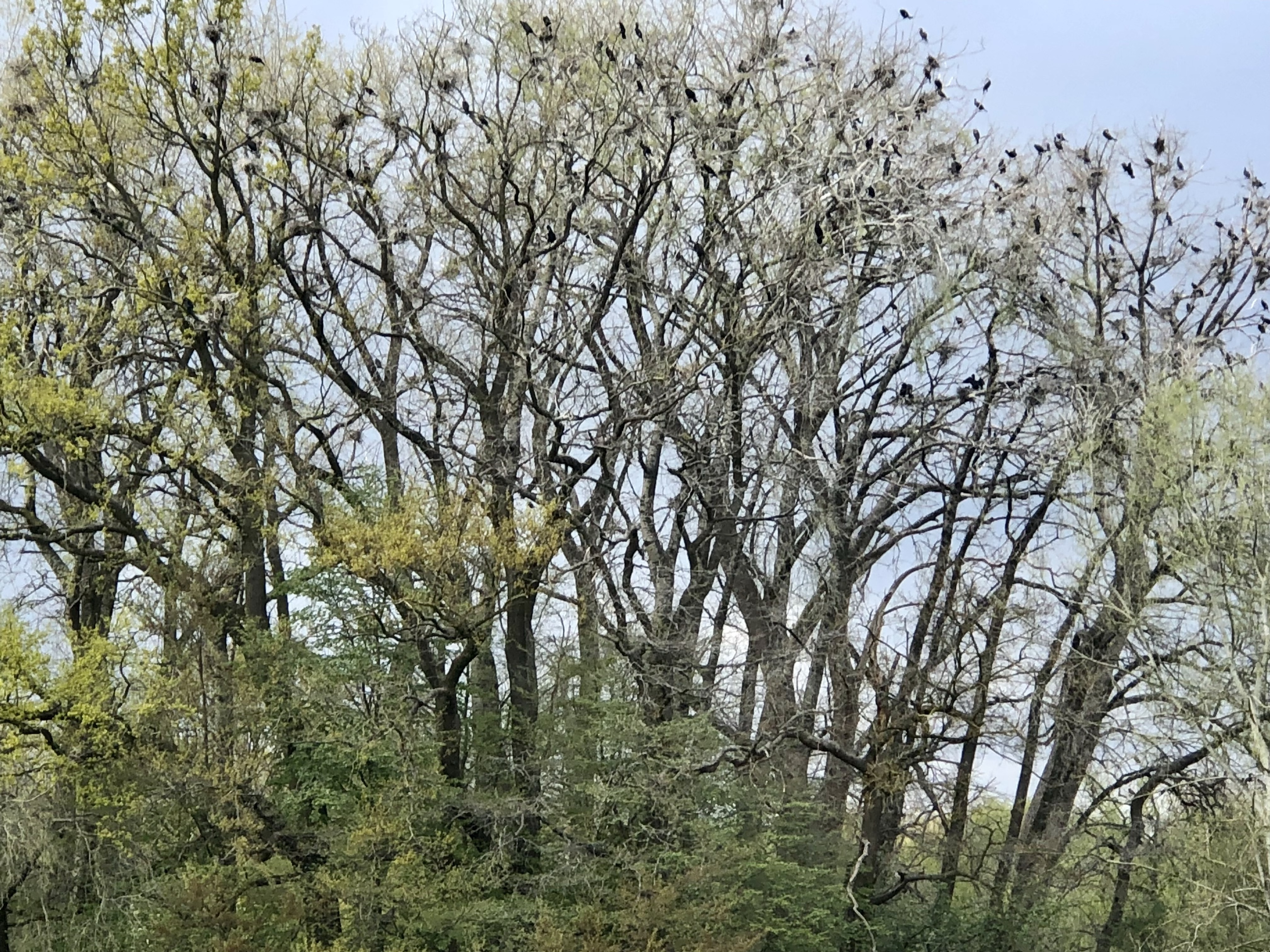 Die vielen schwarzen Punkte auf dem angrenzenden Baum sind alles Kormorane, die auf Beute aus dem See warten, nicht zur Freude der Fischer.