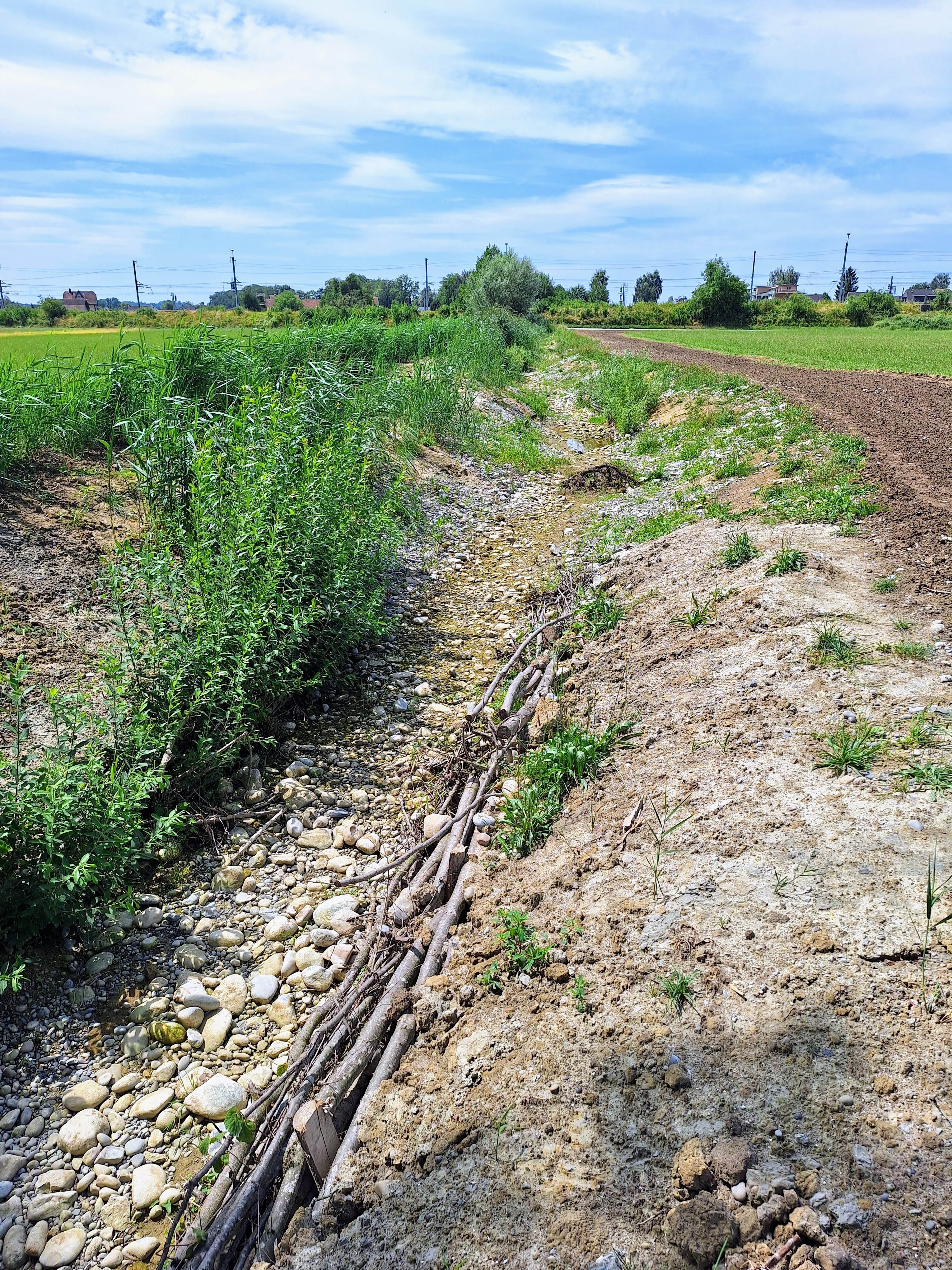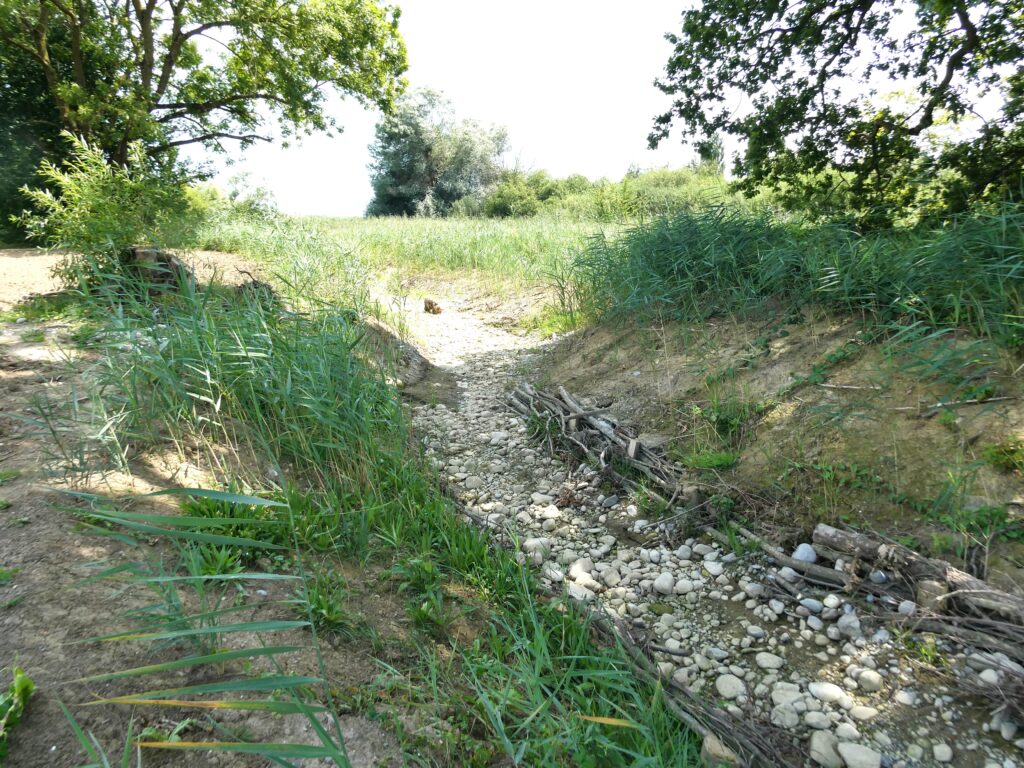 Auch im neu angelegten Bachbett herrscht gähnende Wasserleere. Da kommt mir ein Witz in den Sinn: „Standen zwei Halbschlaue an einem Bachbett, da fragte der eine, wo ist denn jetzt der Bach? Da antwortete ihm der andere, der ist gerade Wasser holen“. Wenn es nicht so Aktuell wäre, wäre es durchaus lustig!