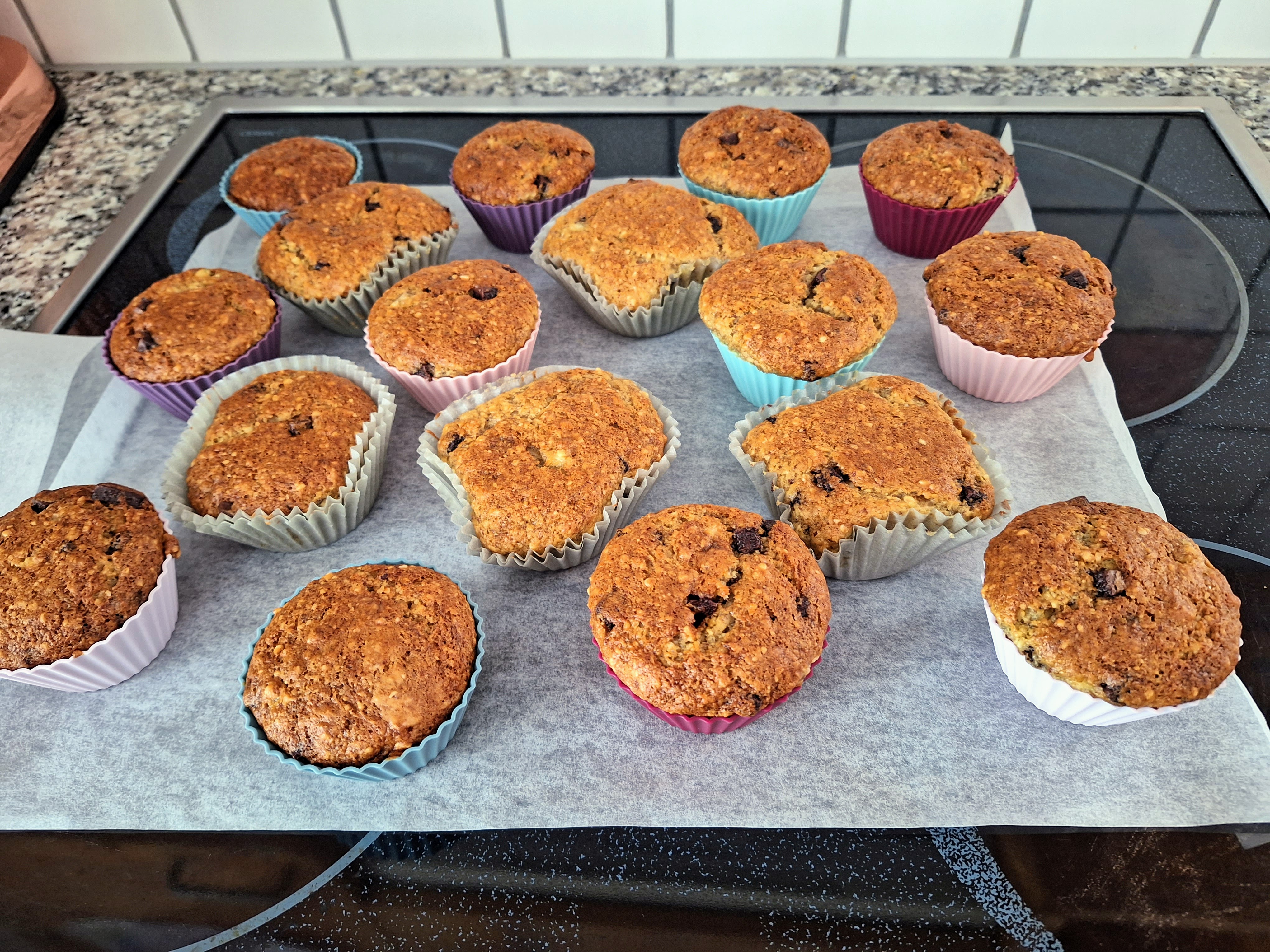 Zuerst drei sehr reife Bananen gut zerdrücken. Dann dreiviertel Tasse Zucker, ein Ei und ein halber TL Salz dazu mischen. Dazu kommt ein Drittel Tasse geschmolzene Butter. Eineinhalb Tassen Mehl mit einem gestrichenen TL Natron und einem gestrichenen TL Backpulver unter die Masse heben. Wir mischten noch eine halbe Tasse gemahlene Mandeln und Schokowürfel dazu. Die Masse in Muffinformen füllen und bei 180° ca. zwanzig Minuten backen.