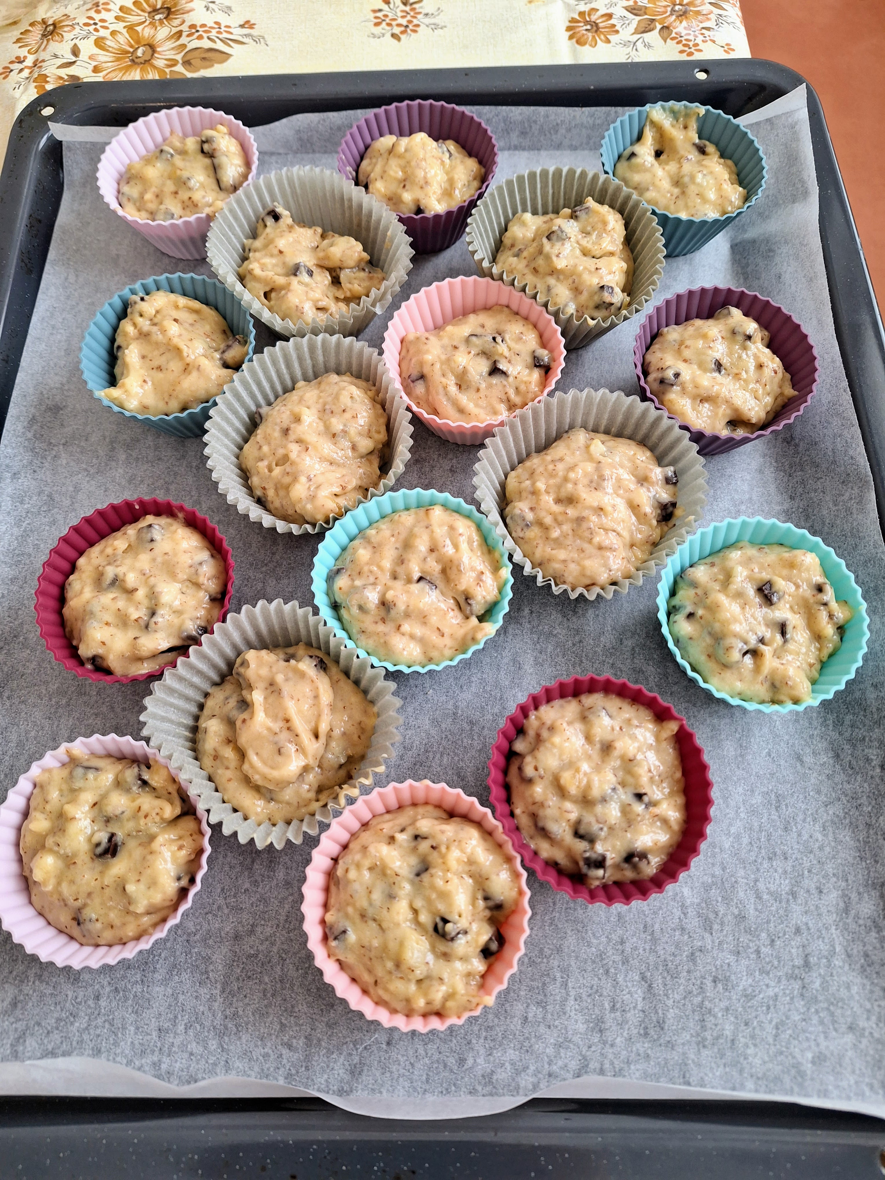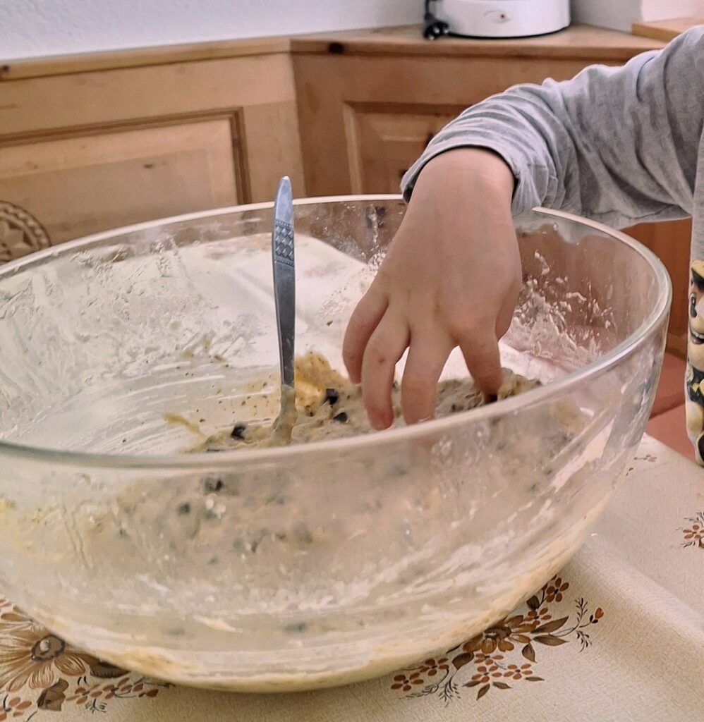Ich musste die Enkelin nicht überreden als ich sie fragte, ob wir mit den reifen Bananen Muffins backen sollen in den Ferien. Wir hatten ja ein ganzes Ferienhaus für uns allein und die Küche war sehr gut ausgestattet. Mit grossem Eifer zerdrückte sie Bananen und mischte die übrigen Zutaten. Natürlich mussten die kleinen Händchen immer wieder naschen, ob der Teig auch wirklich gut ist.