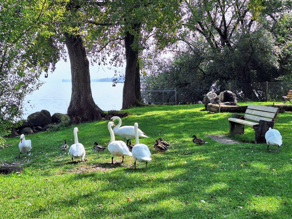 Von der Schwaneninvasion bei uns am See zeigte ich bereits Bilder. Lange waren die Schwäne nur am Ufer der Flussmündung in den See. Unzählige weisse Federn habe ich mit der Enkelin gesammelt.