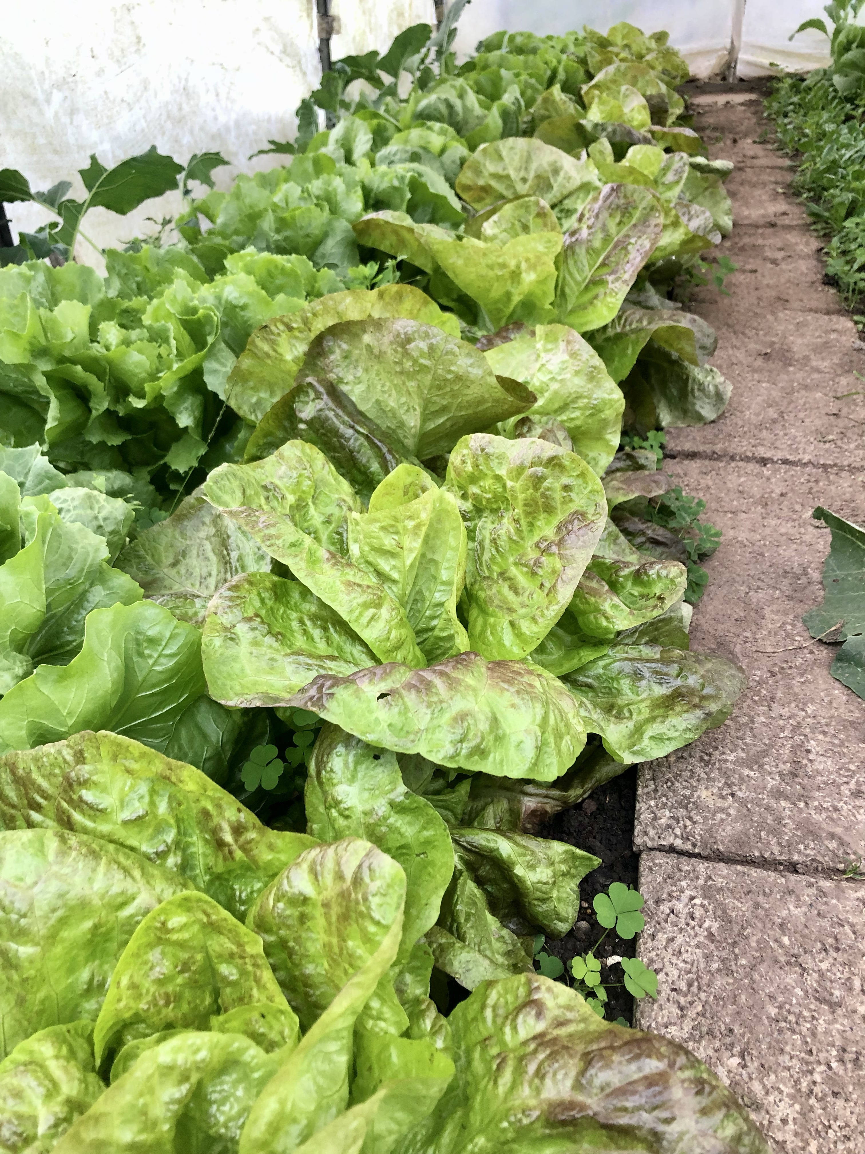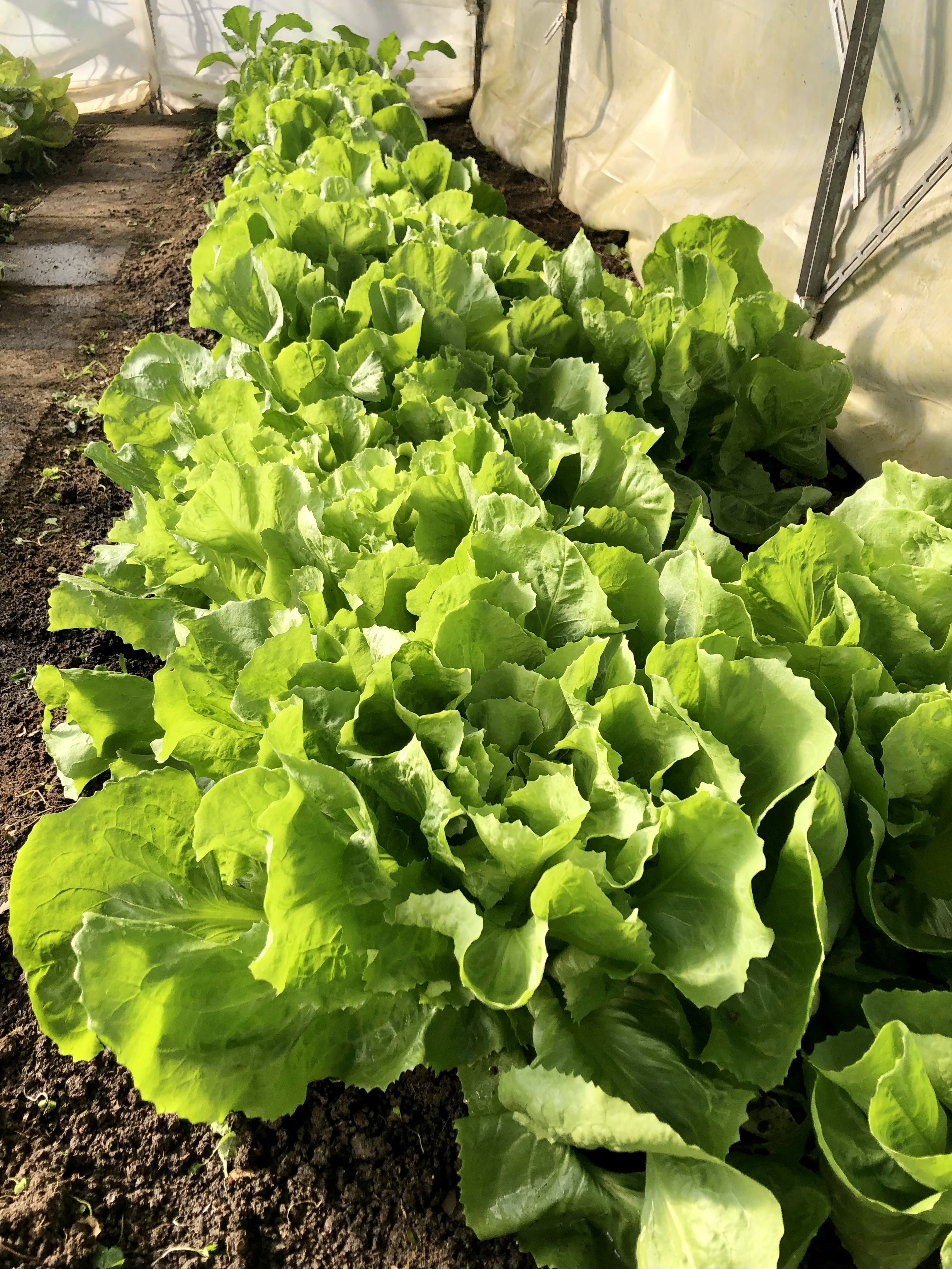 Auf der anderen Seite des Treibhauses wachsen Endiviensalate. Wir pflanzen unsere Tomaten extra etwas weiter auseinander, dass es Platz hat, um im Herbst Salat zu pflanzen.