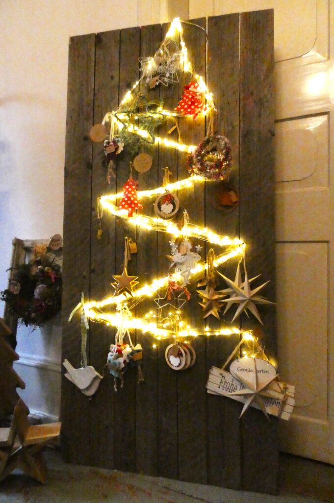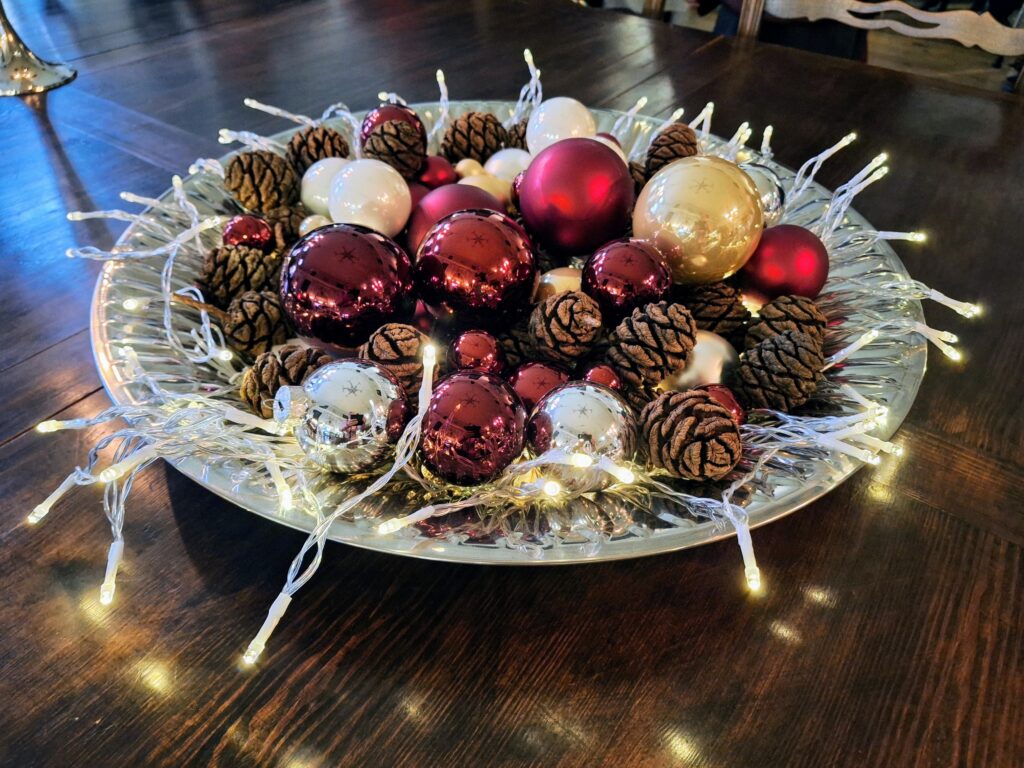 Die Schale mit den glänzenden Kugeln, kombiniert mit Föhrenzapfen und einer Lichterkette, hat mich inspiriert. Echte Kerzen sind nicht immer die beste Wahl.