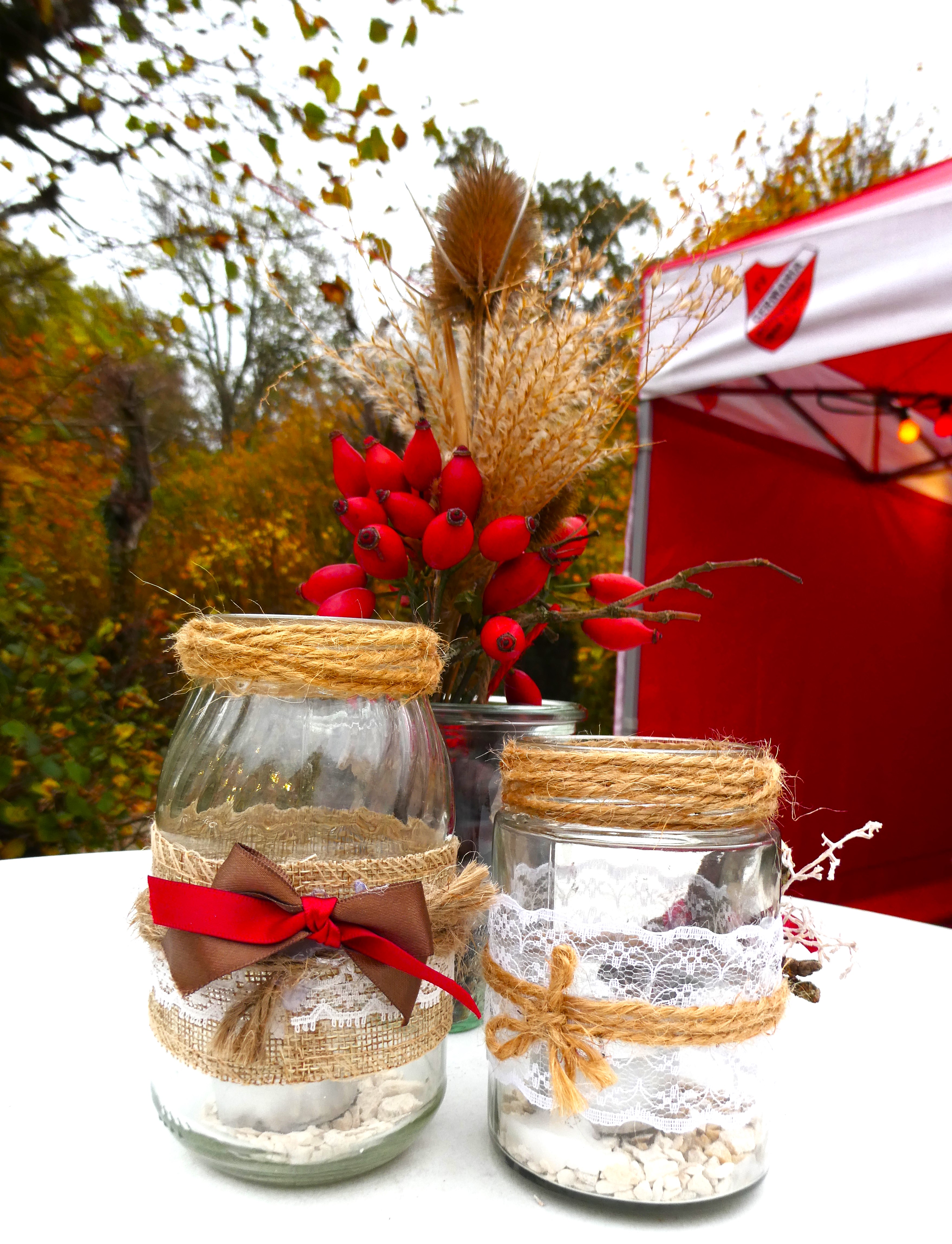 Ich habe heute einige rote Impressionen von der Kunstausstellung aufbewahrt. Oft sind es die einfachen Kreationen, die mit reichlich Naturmaterialien gestaltet sind, die besonders beeindrucken. Solche Windlichter sind das ganze Jahr über nützlich.
