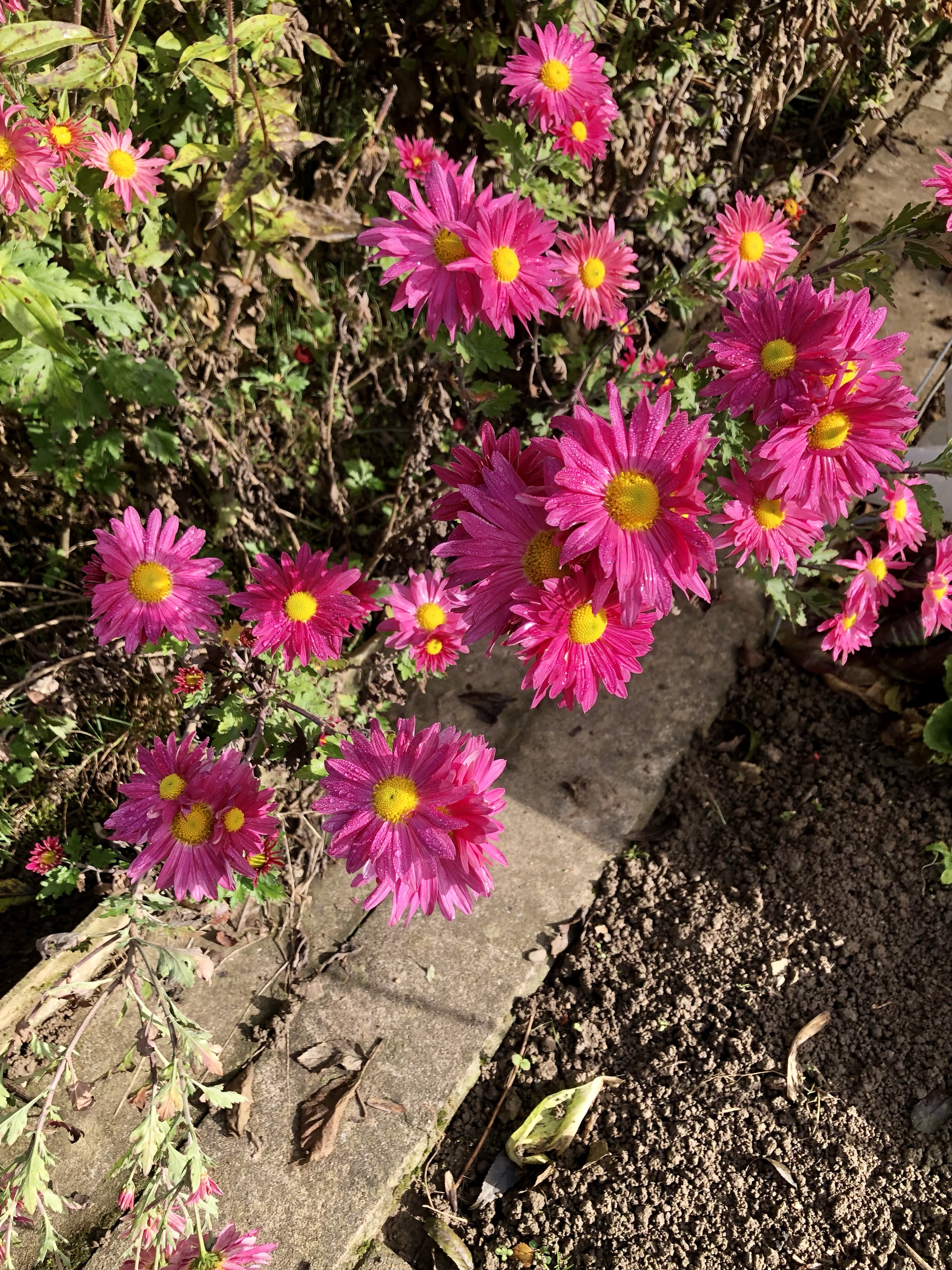 Auch wenn das Laub der Astern nicht mehr schön ist, leuchten die Blütenköpfe in der Sonne.