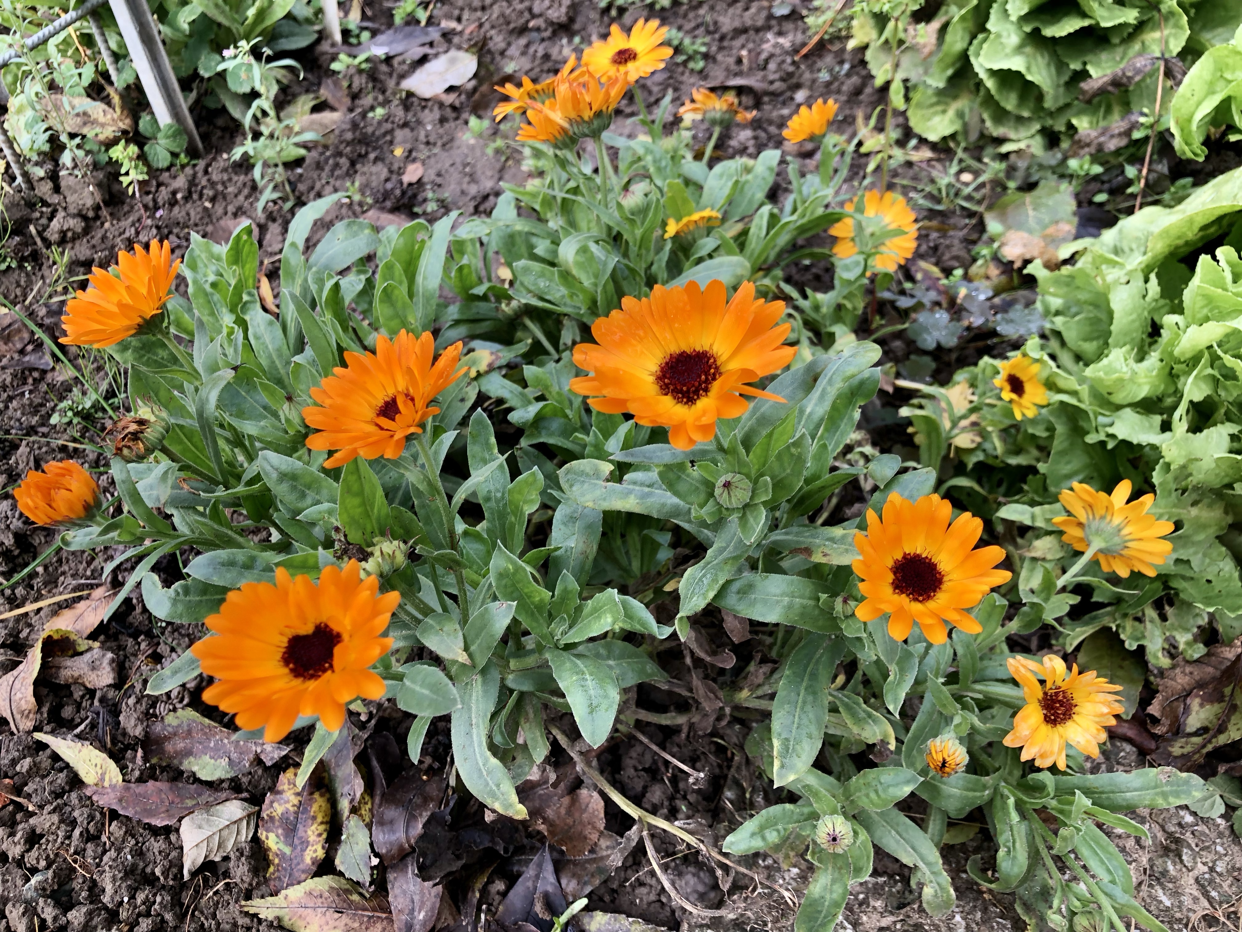 Ringelblumen gibt es im ganzen Garten verstreut.