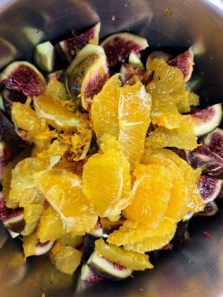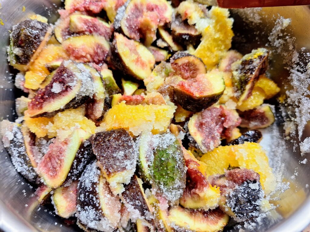 Da wir jedoch nicht alle Feigen auf einmal verzehren konnten, entschloss ich mich, ein Rezept für Feigen-Orangenkonfitüre auszuprobieren. Das Rezept besteht aus zwei Teilen Feigen und einem Teil Orangenfilets, die mit Zucker aufgekocht und über Nacht stehen gelassen werden, damit sich die Aromen voll entfalten können.
