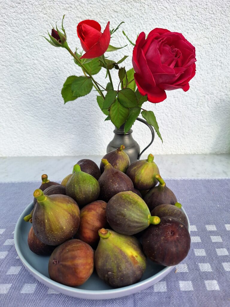Jeden Tag können wir noch Feigen ernten und die roten Rosen stehen nun schon eine Woche in der kleinen Zinkvase.