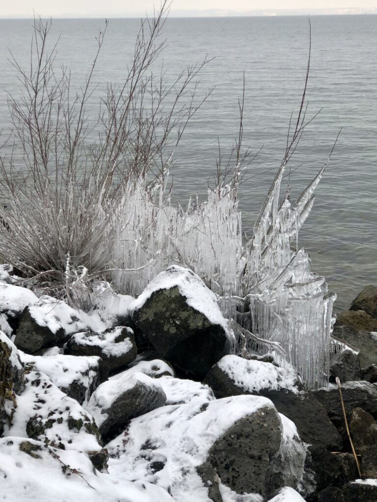 Am Ufer bestaunte ich noch immer die Eisskulpturen – die Nächte sind ja immer noch eisig kalt.