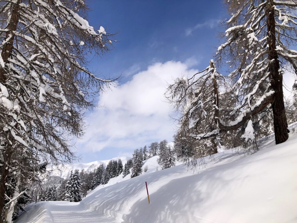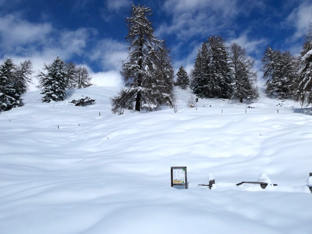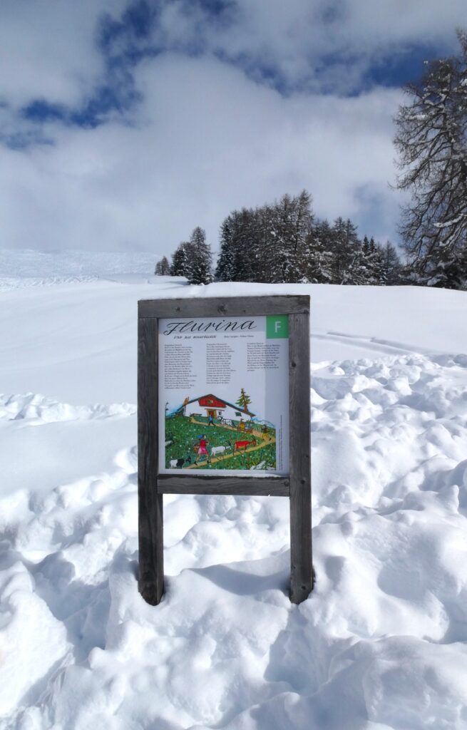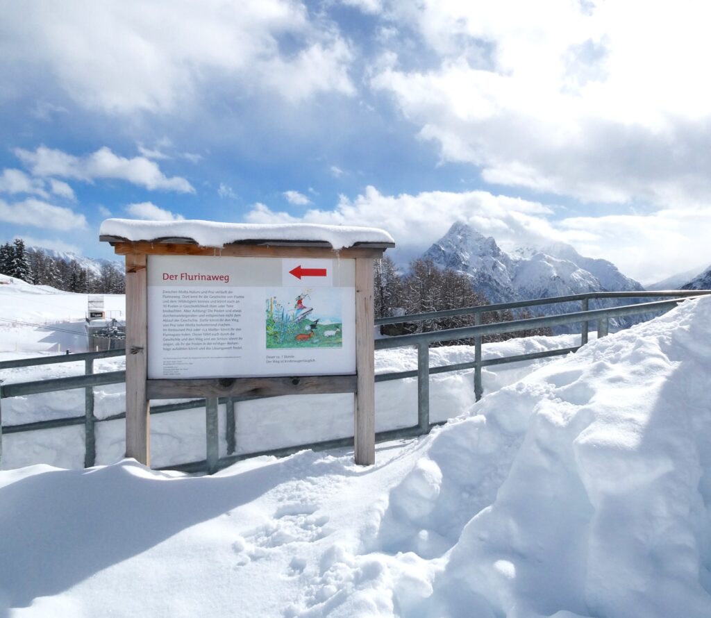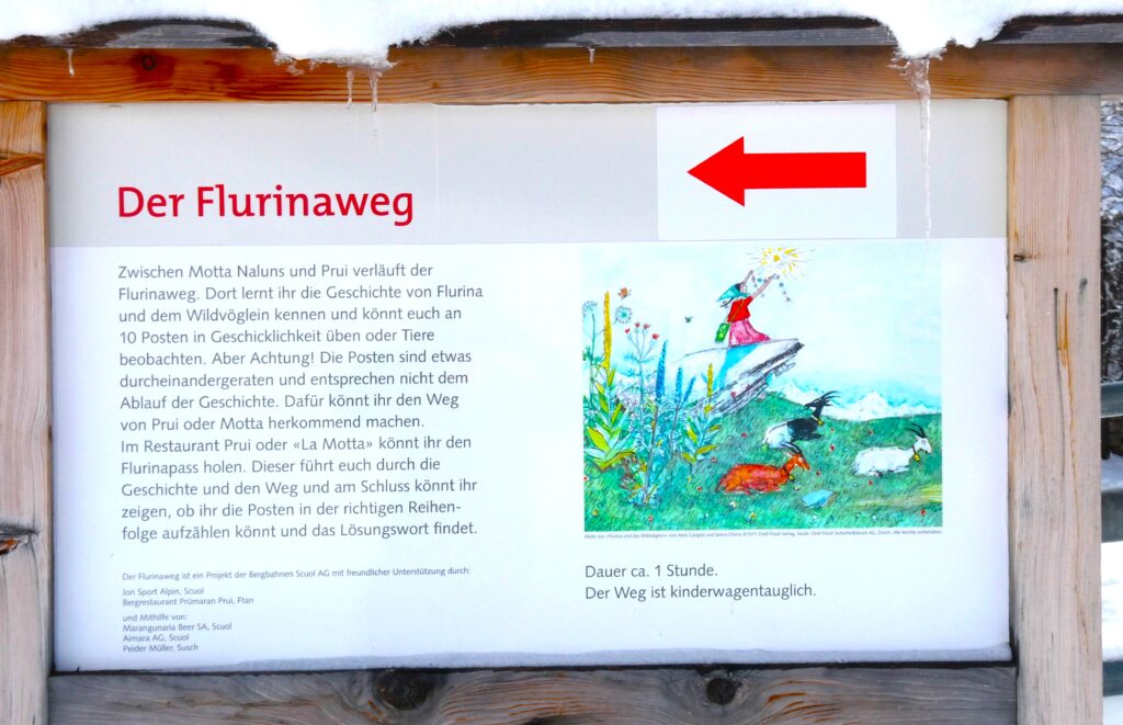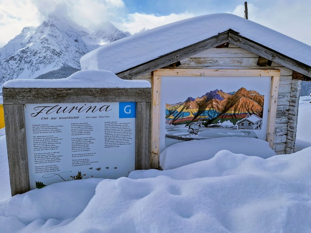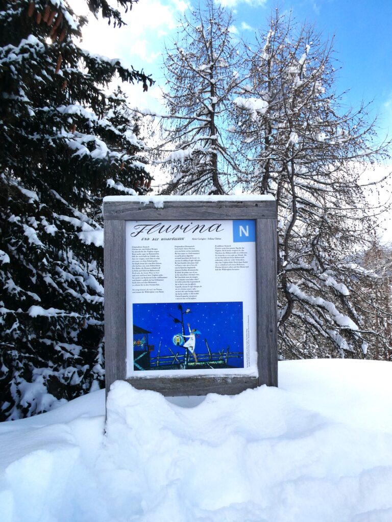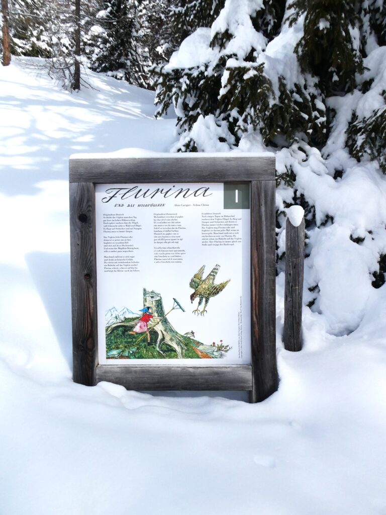 Entlang des Weges informieren 10 Stationen mit Infotafeln über die Geschichte von „Flurina und dem Wildvöglein“. Flurina, die Schwester des bekannten Schellen Ursli, ist ebenfalls Protagonistin eines Buches von Selina Chönz, illustriert von Alois Carigiet. Im Sommer bietet der Weg die Möglichkeit, in die Geschichte einzutauchen und sie hautnah zu erleben. Während unseres Spaziergangs waren die Infotafeln teilweise fast gänzlich vom Schnee bedeckt. Doch im letzten Sommer, als wir den Weg mit unserer Enkelin gegangen sind, hat sie an den verschiedenen Stationen alles mit grosser Begeisterung ausprobiert.