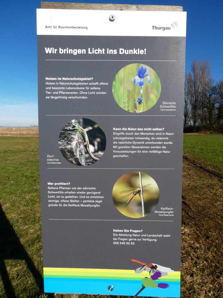 Eine Infotafel klärt die Spaziergänger darüber auf, welchen Nutzen Naturschutzgebiete haben, und dass sie keinesfalls nur vernachlässigte Landstücke sind, wie manche immer noch glauben.