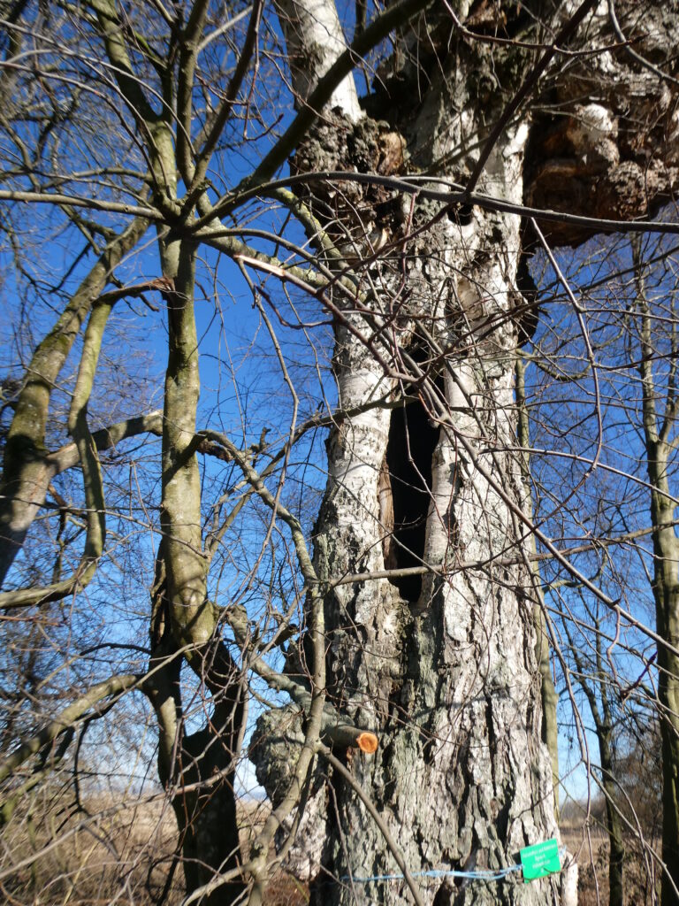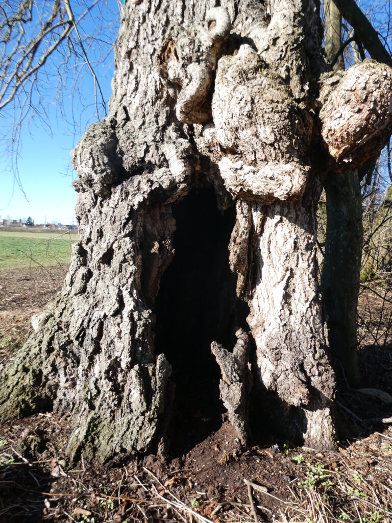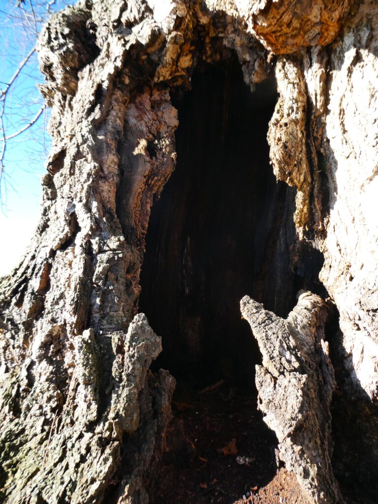 Vielerorts wird jetzt gerodet, so auch rund um den beeindruckenden Höhlenbaum, der sonst fast verborgen blieb. Ein knorriger Riese, dessen Eingang jetzt gut zu erkennen ist – ich hoffe, er bleibt von Vandalismus verschont.