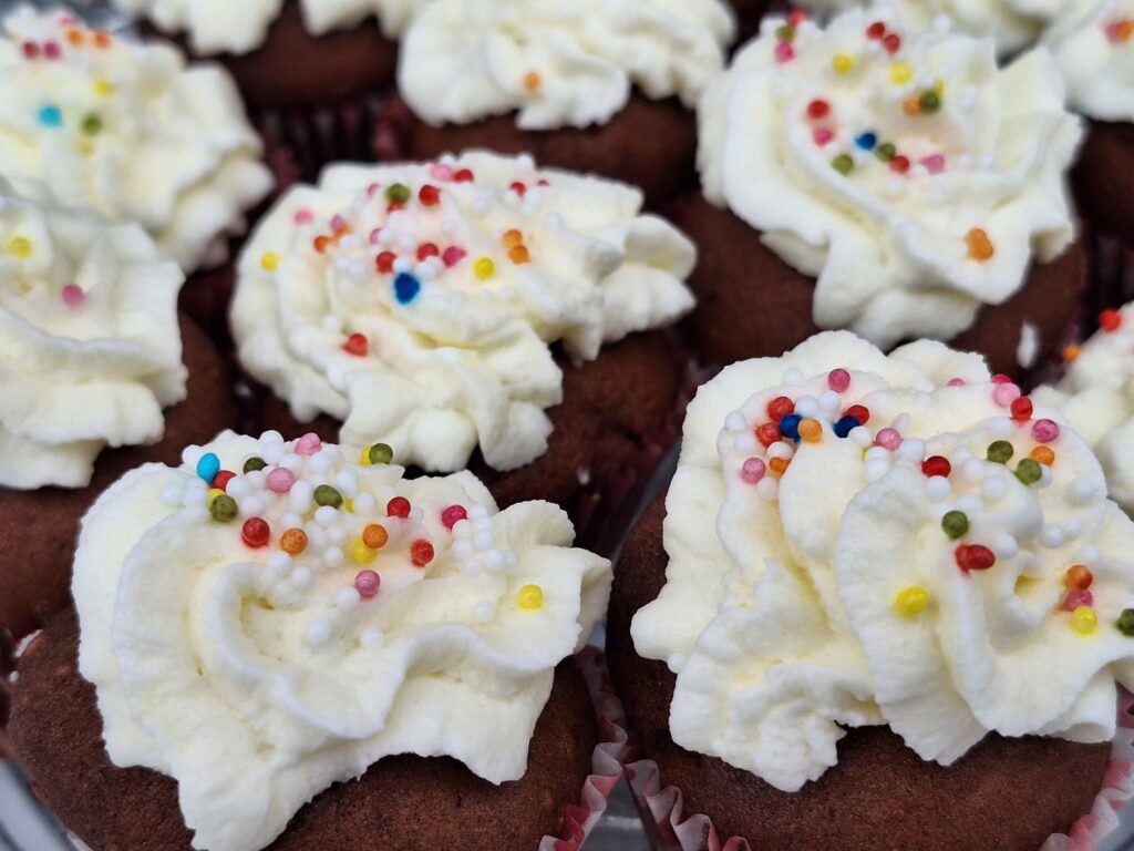 Auf den dunklen Keksen war das Topping weiss mit bunten Streuseln – natürlich fürs Auge!