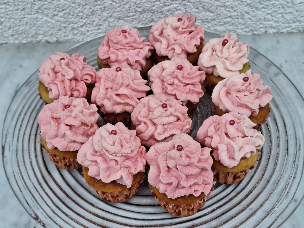 Die kleinen Cupcakes waren so konzipiert, dass sie gerade in den Mund passen und somit ohne Gabel gegessen werden können. Das rosa Topping bestand aus Schlagsahne mit Puderzucker.