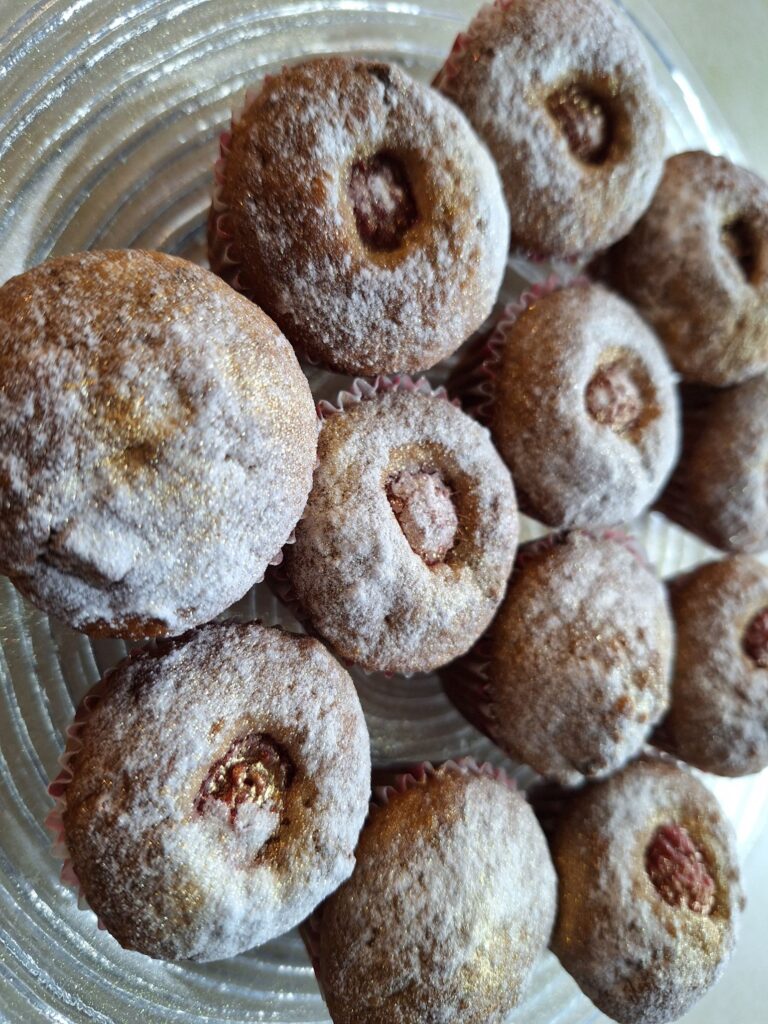 Die beliebten Bananenmuffins gab es mit einer Himbeere in der Mitte und, was man auf dem Foto schlecht sehen kann, ich habe sie mit Goldspray verziert.