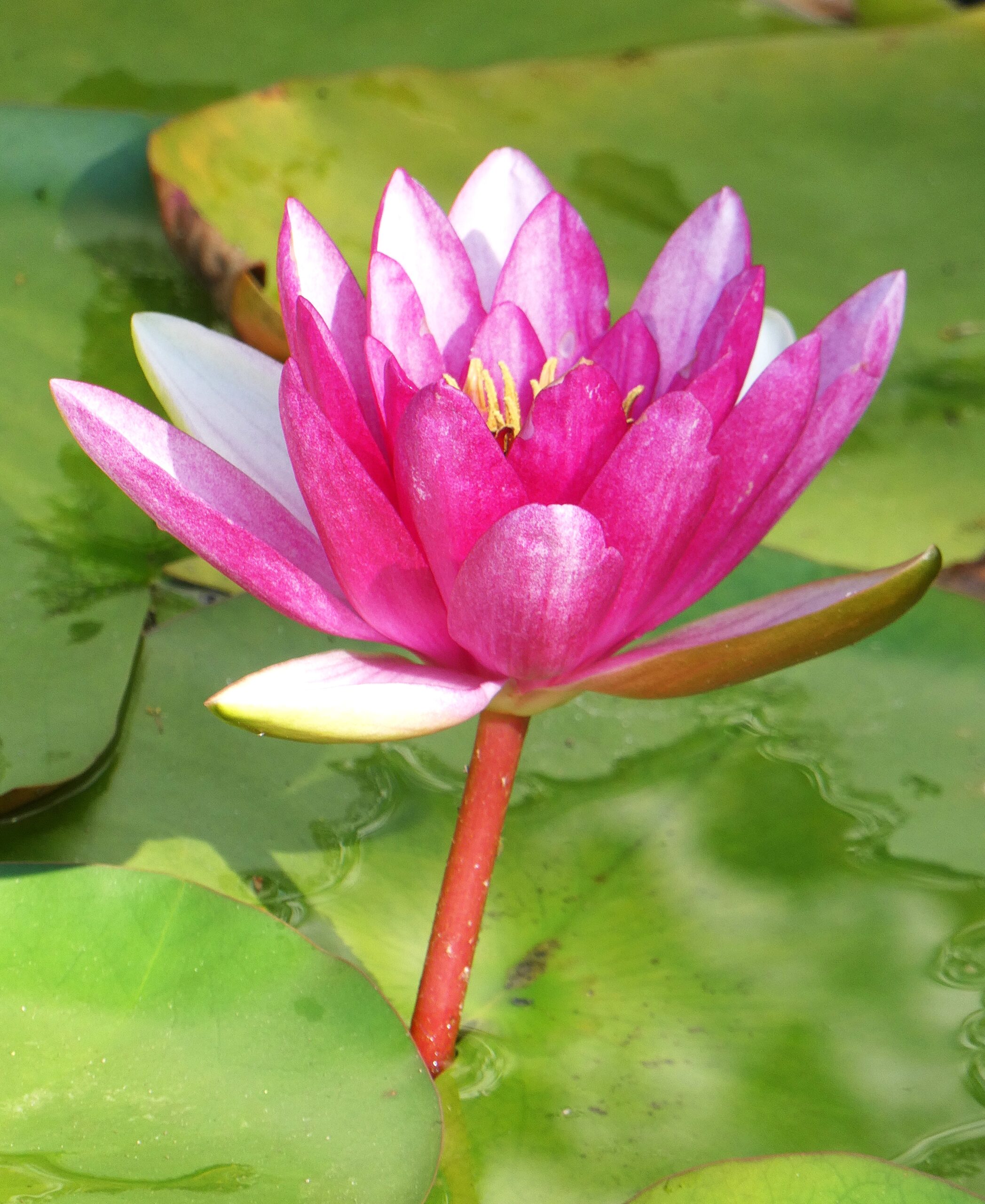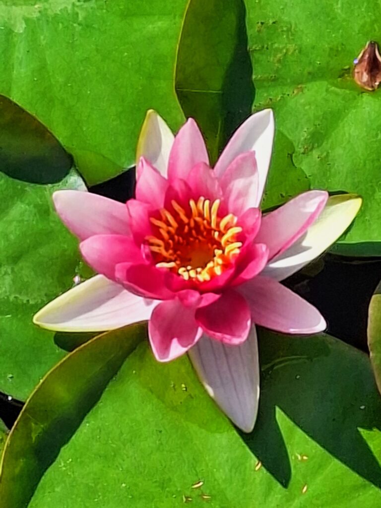 Besonders begeistert mich eine Seerosenblüte, die mit einem Stiel aus dem Wasser ragt. Normalerweise blühen Seerosen direkt auf der Wasseroberfläche, aber diese erinnert mich an die Lotusblüten, die mit ihren Stielen über dem Wasser thronen und uns an unsere Reisen nach Asien zurückdenken lassen, wo sie häufig zu sehen sind.