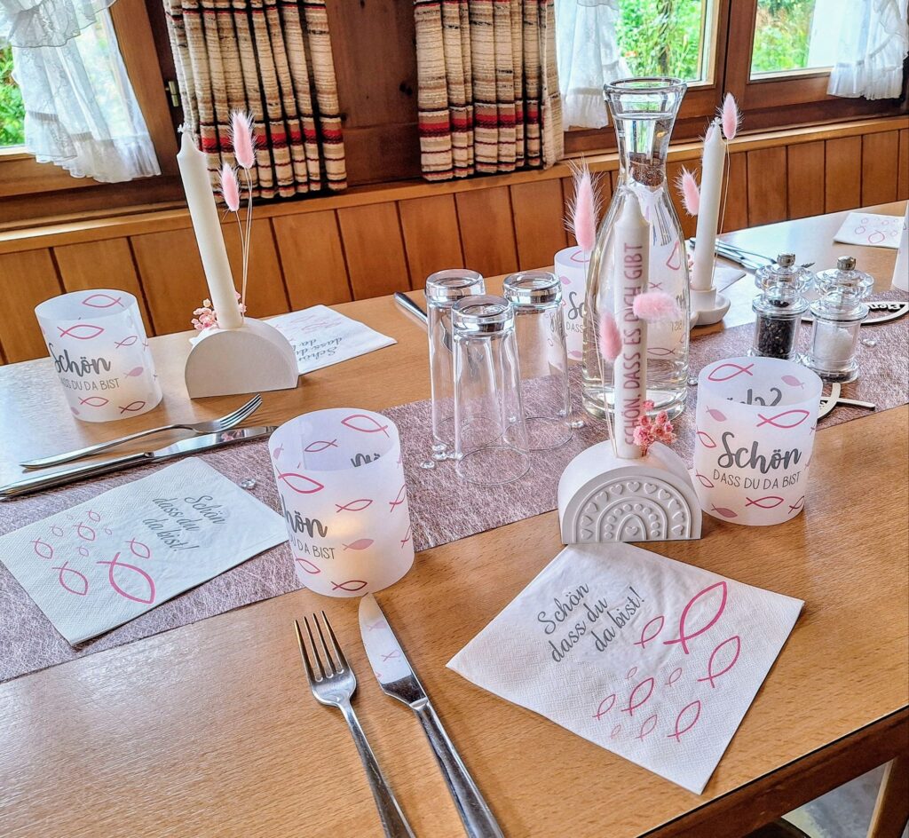 Und die Tischdekoration lässt schon alleine ein wunderschönes Fest vermuten. Herzliche Glück- und Segenswünsche dem Taufkind mit seiner Familie!