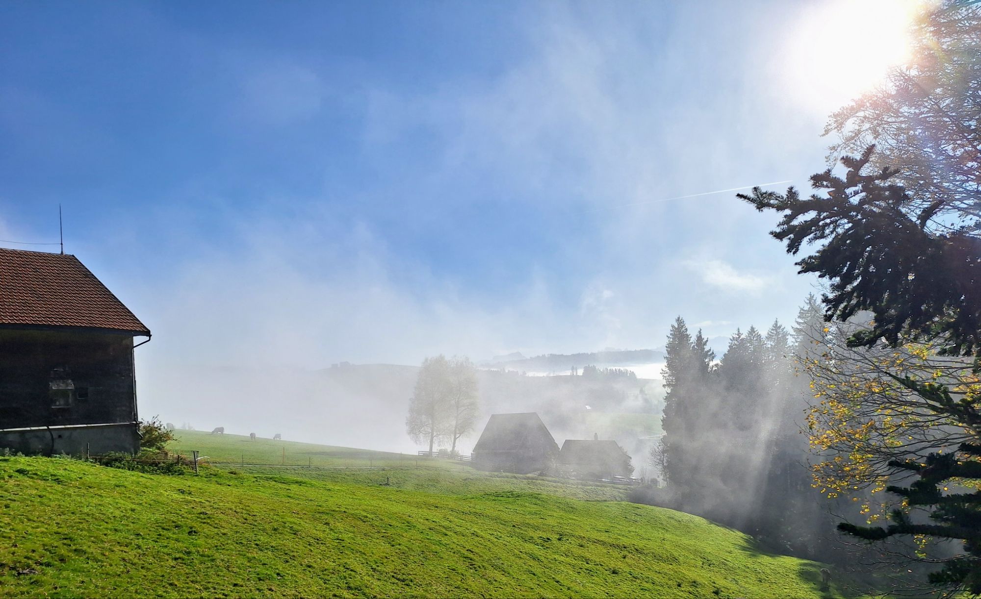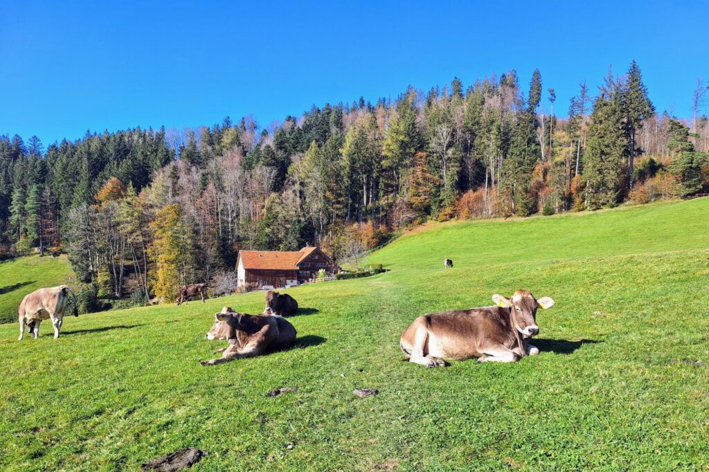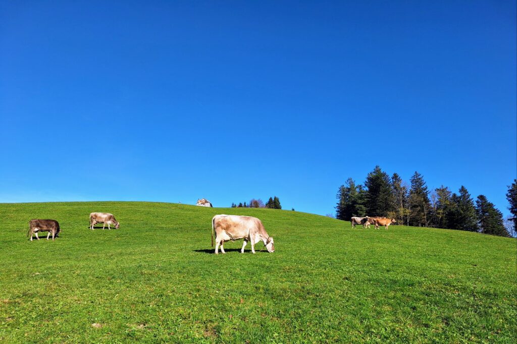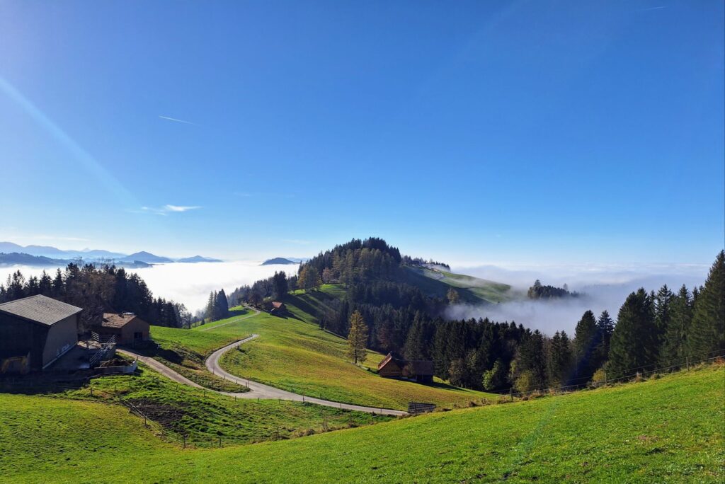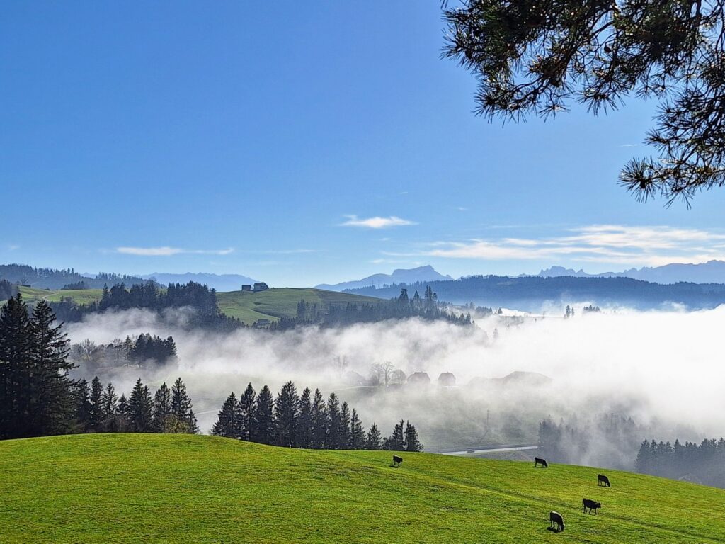 Mit strahlend blauem Himmel und dem beruhigenden Klang der Kuhglocken machten wir uns auf den Heimweg – mit Sonne im Herzen und dem Wissen, wie gut wir es haben, dass wir so schnell über die Nebeldecke gelangen können.