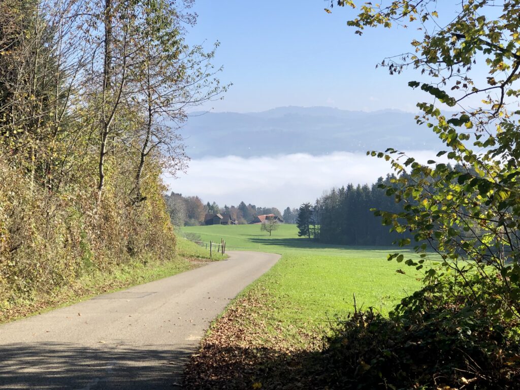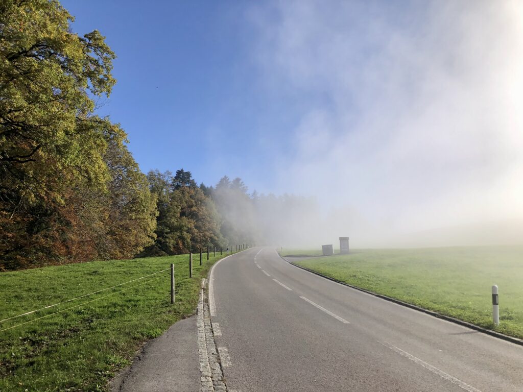 Gestern konnte ich hier erleben, wie sich auf einer kurzen Strecke der Nebel verteilte – es reichten ein paar Meter Steigung oder Gefälle und man war im Grau oder im Blau.