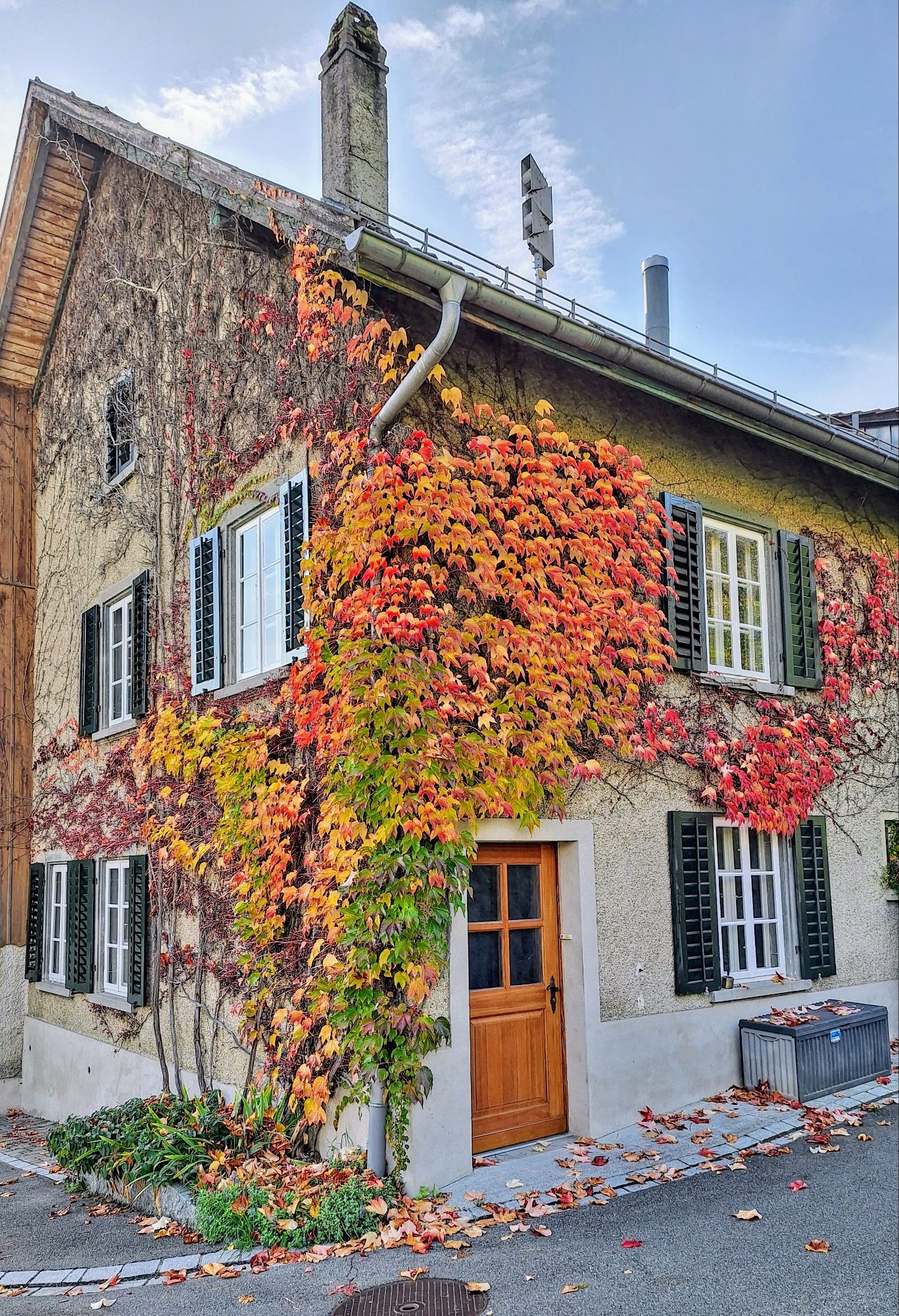 Zum Glück hebt sich die Nebeldecke oft schneller am Wohnort unserer Enkelinnen, und so hatte ich schon mehrmals das Glück, an meinen Hütetagen den Nachmittagsspaziergang mit Sonnenschein geniessen zu können. Wir alle gehen gerne am Haus mit dem wilden Wein vorbei – ich, um ein Foto zu machen, und die Enkelinnen, um die wunderschönen bunten Blätter zu sammeln. Das Foto sende ich an Gabis Projekt „Farben und Formen“.