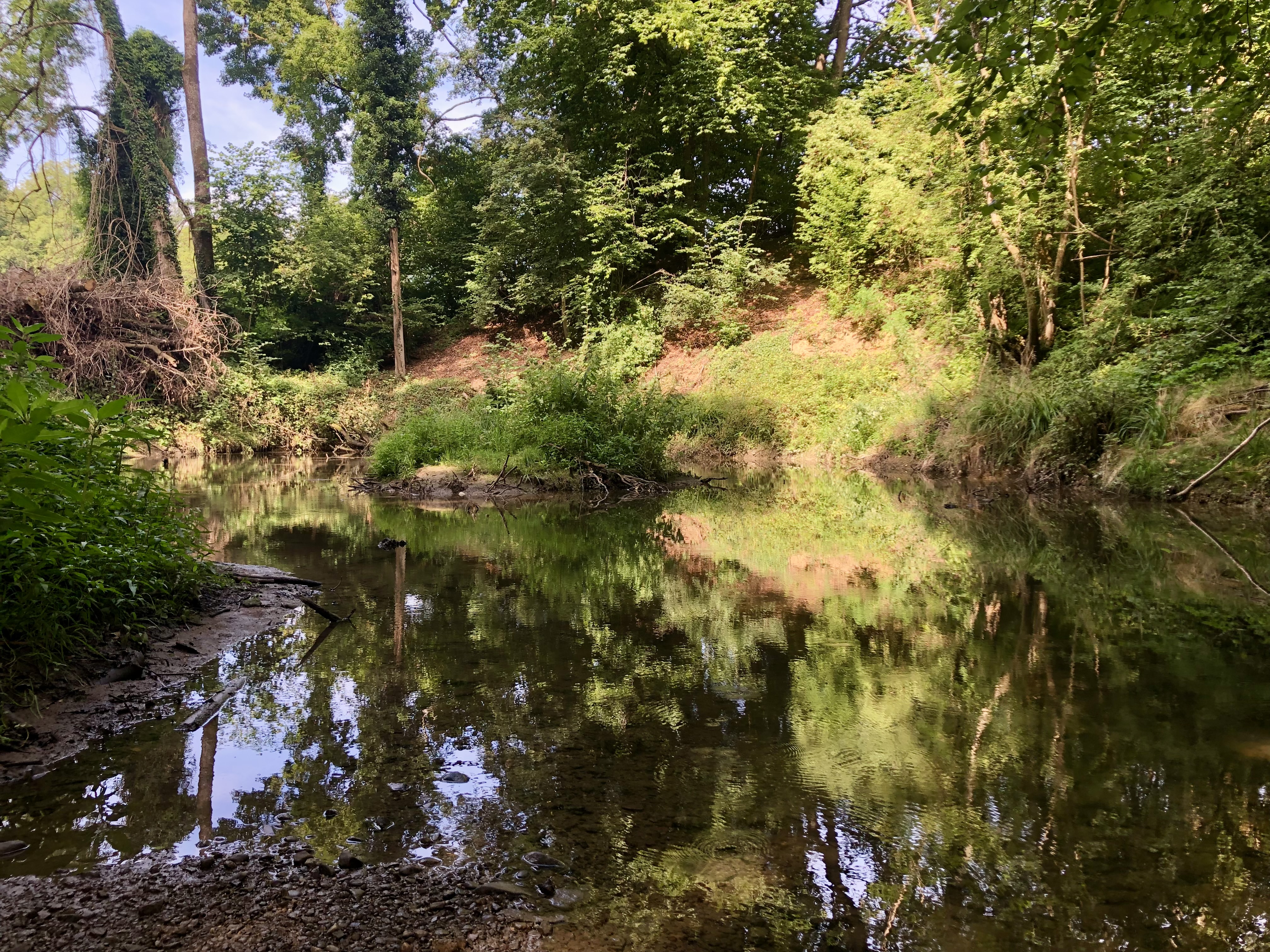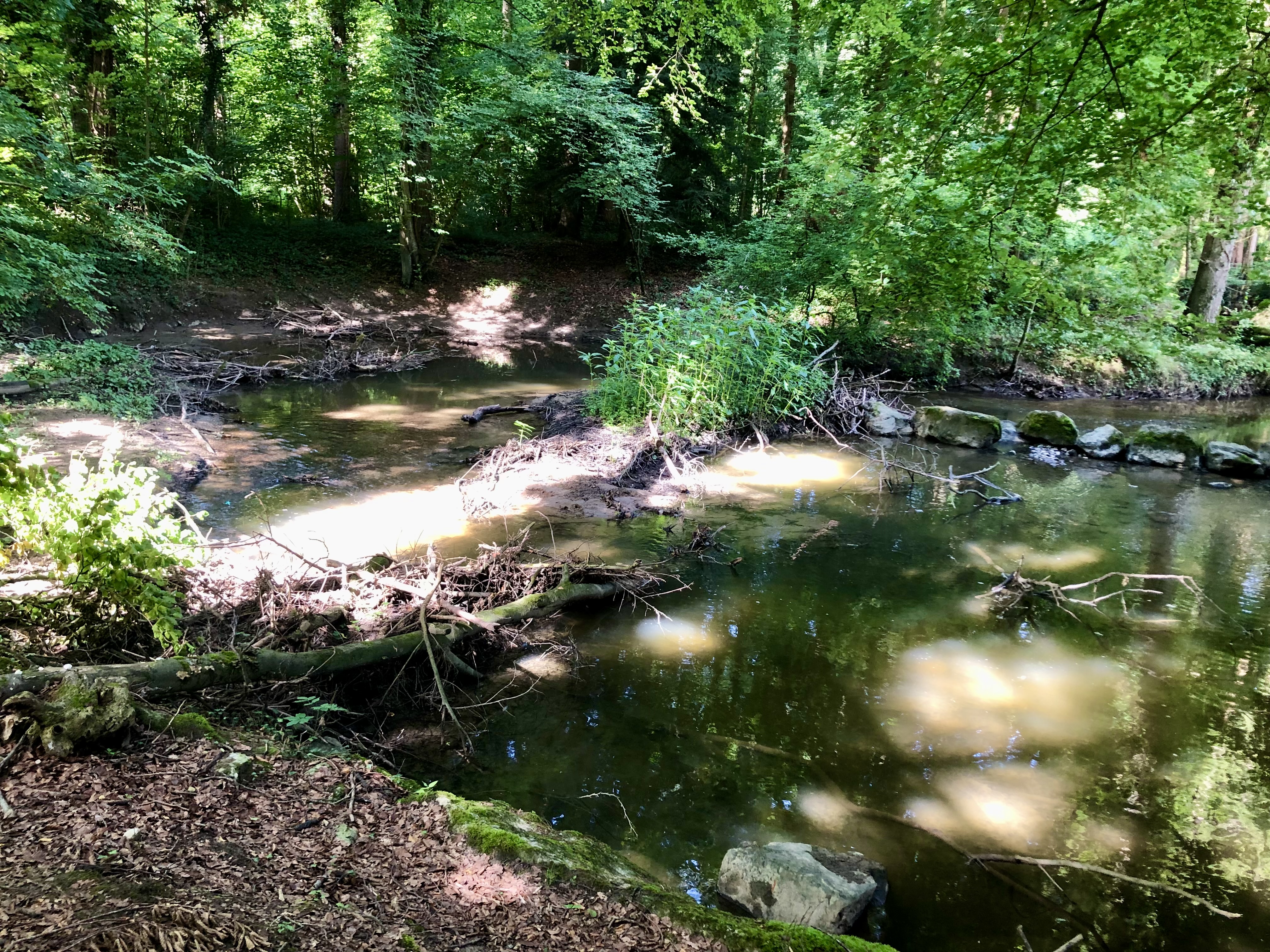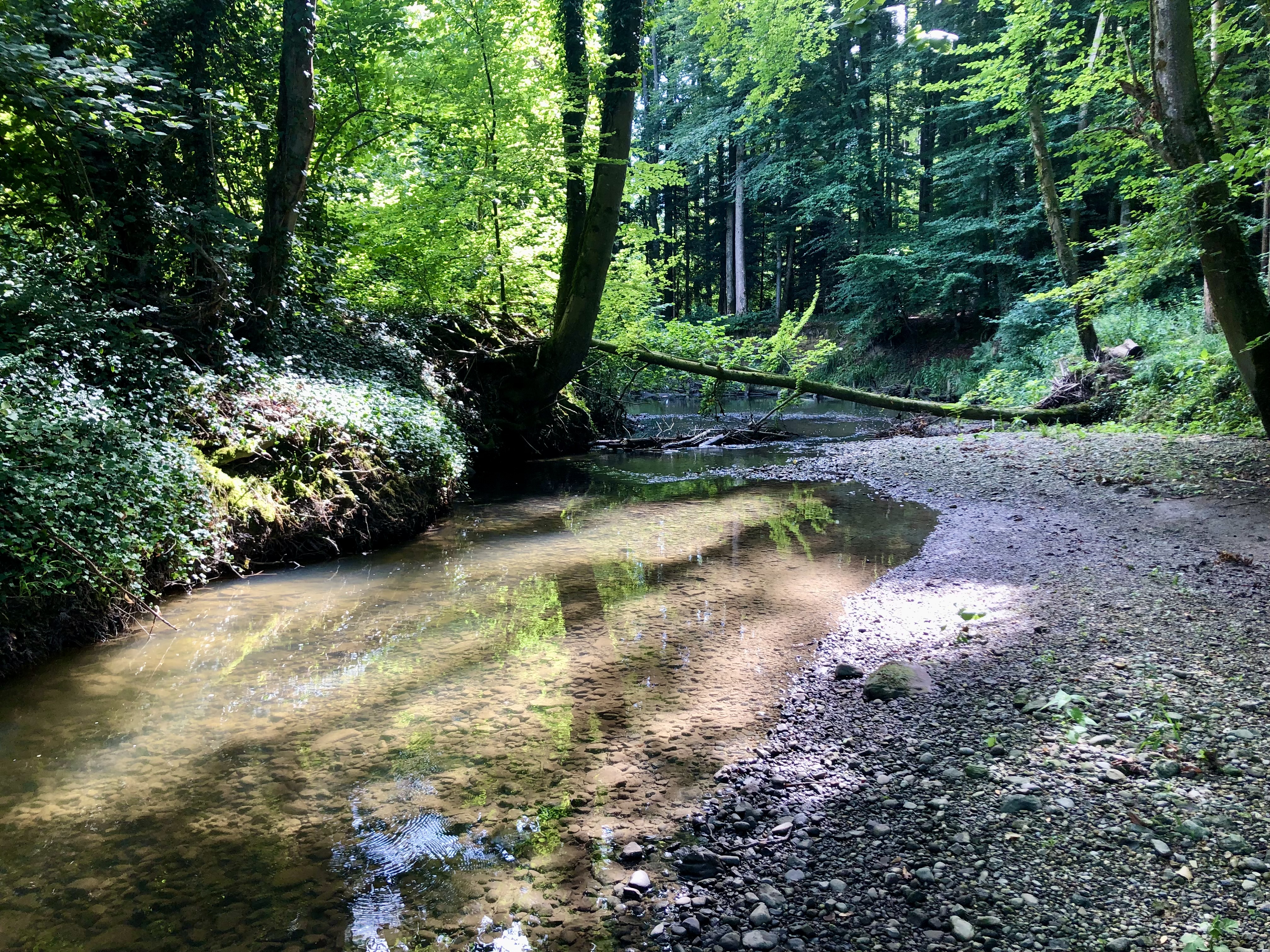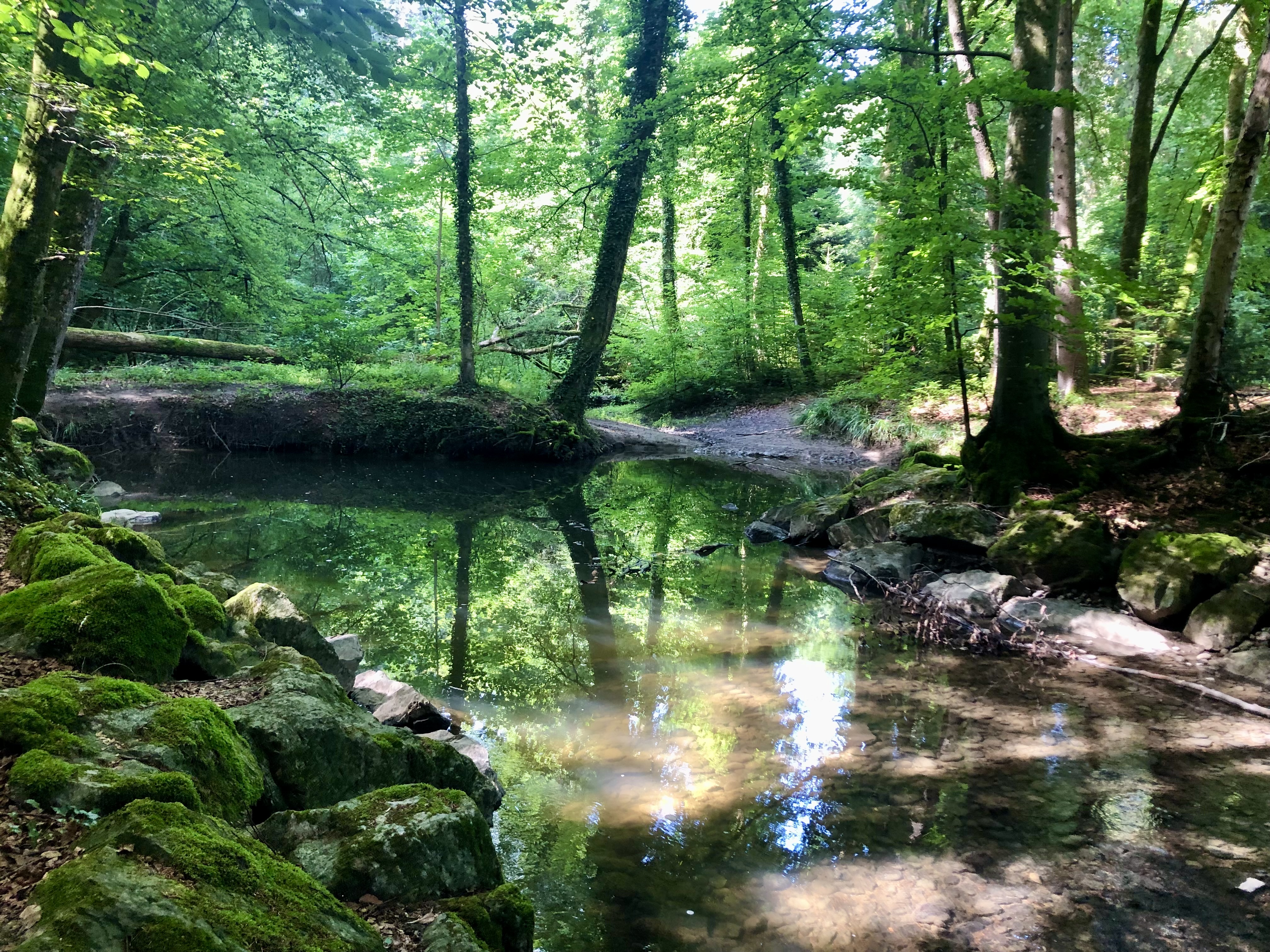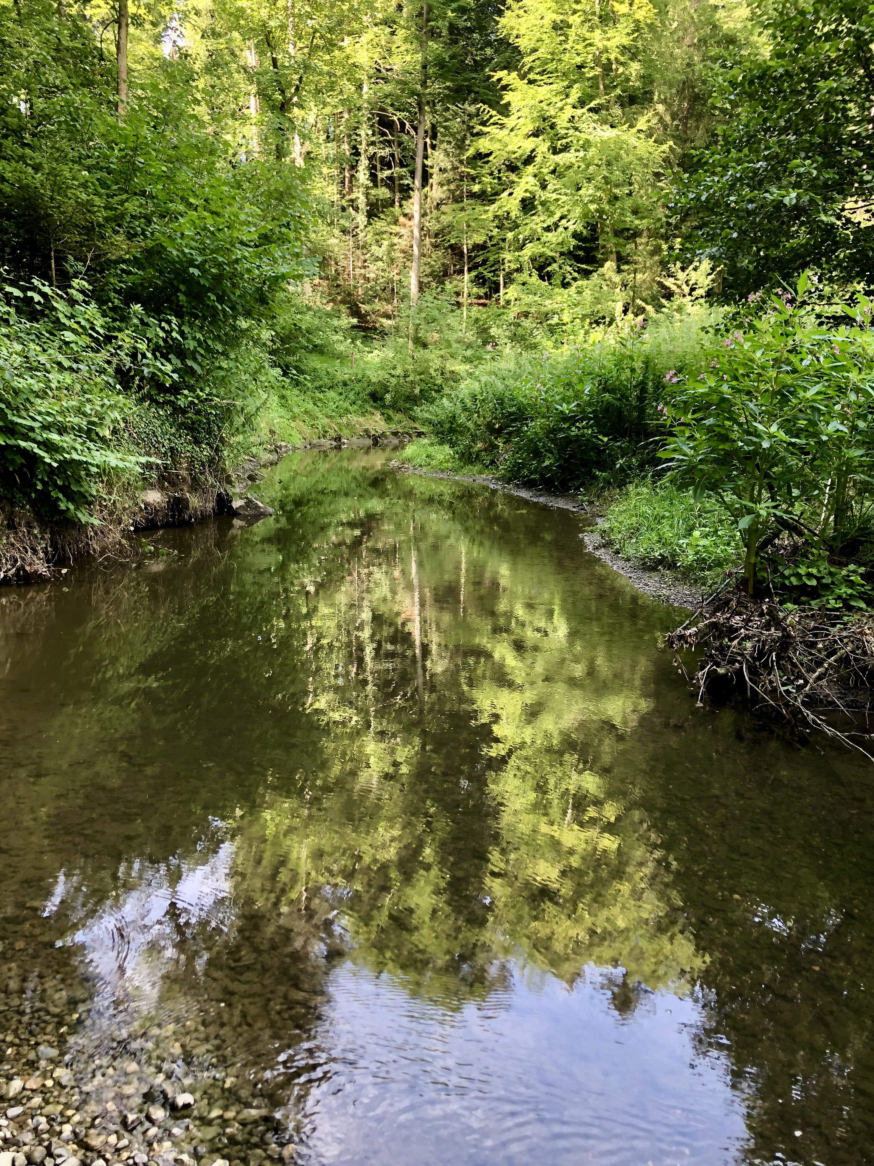 Plötzlich spiegeln sich die umliegenden Bäume im Bachbett.