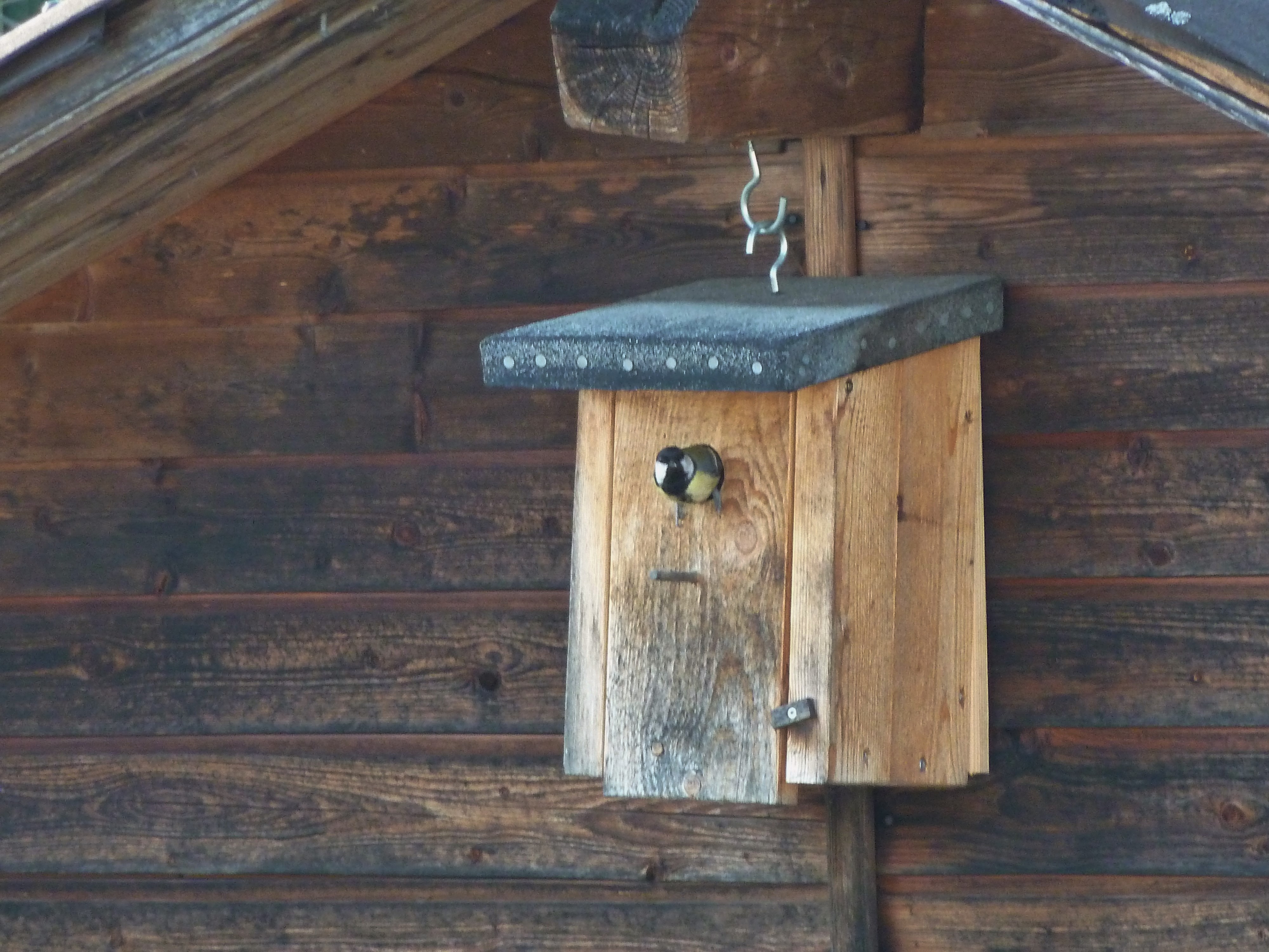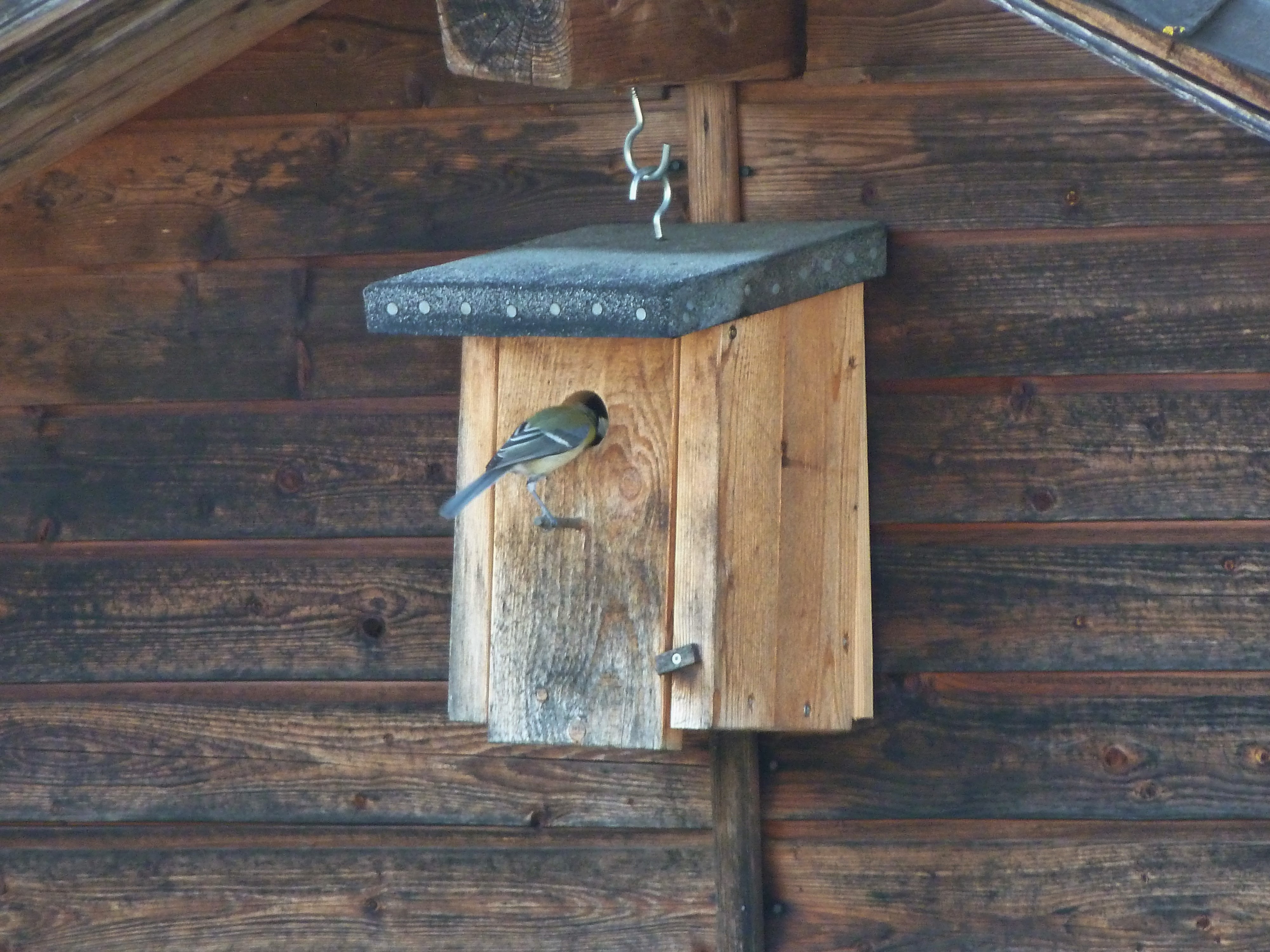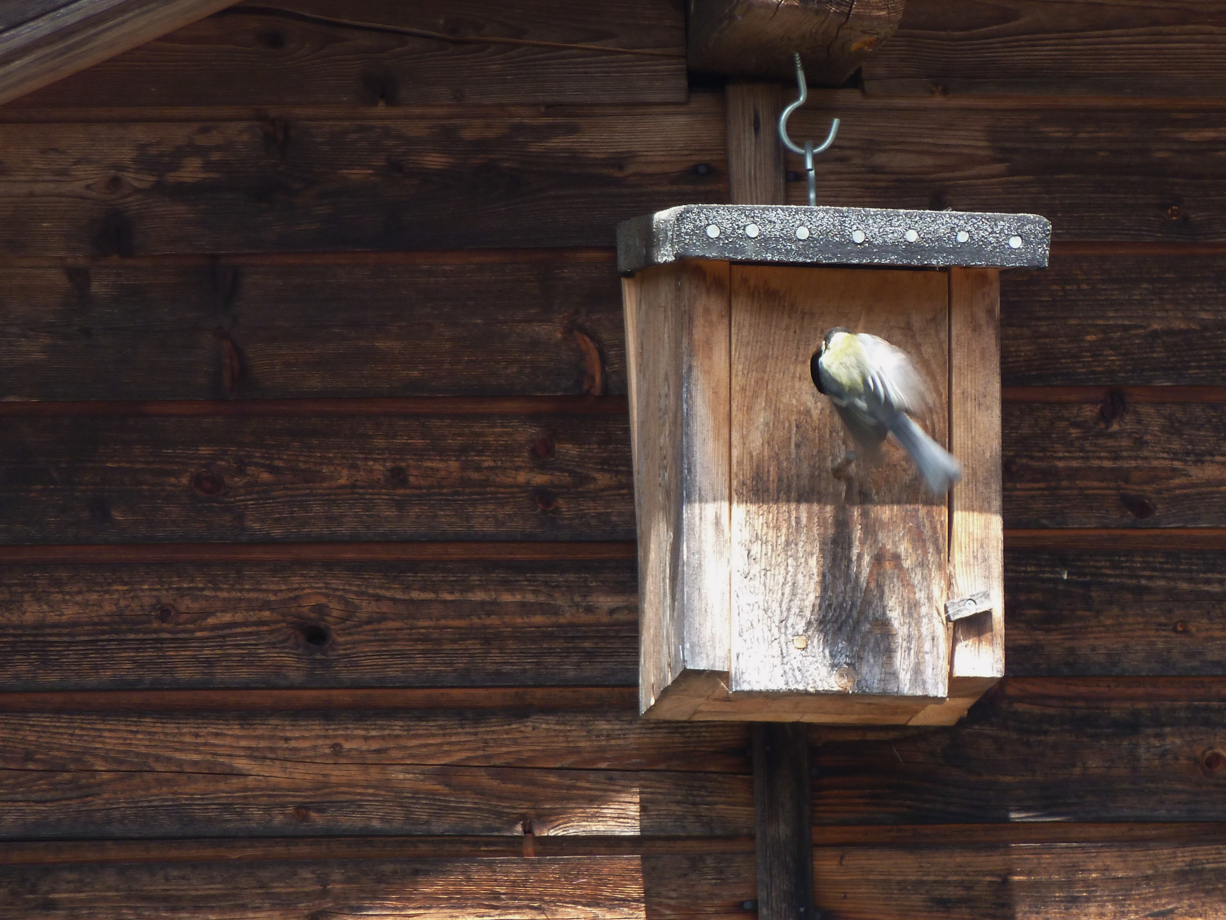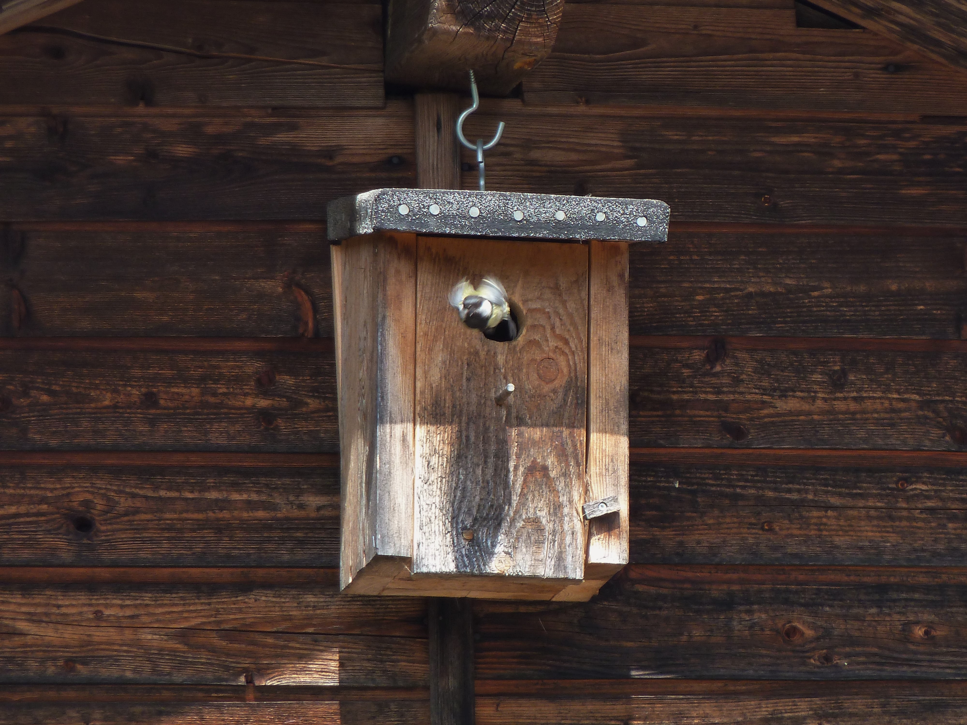 Das Loch am Vogelhaus ist gerade gross genug für die Meisen. Fast noch im Flug fliegen sie zielsicher in die Öffnung.