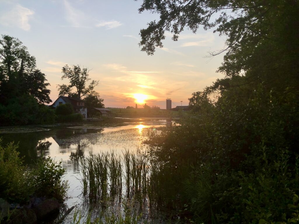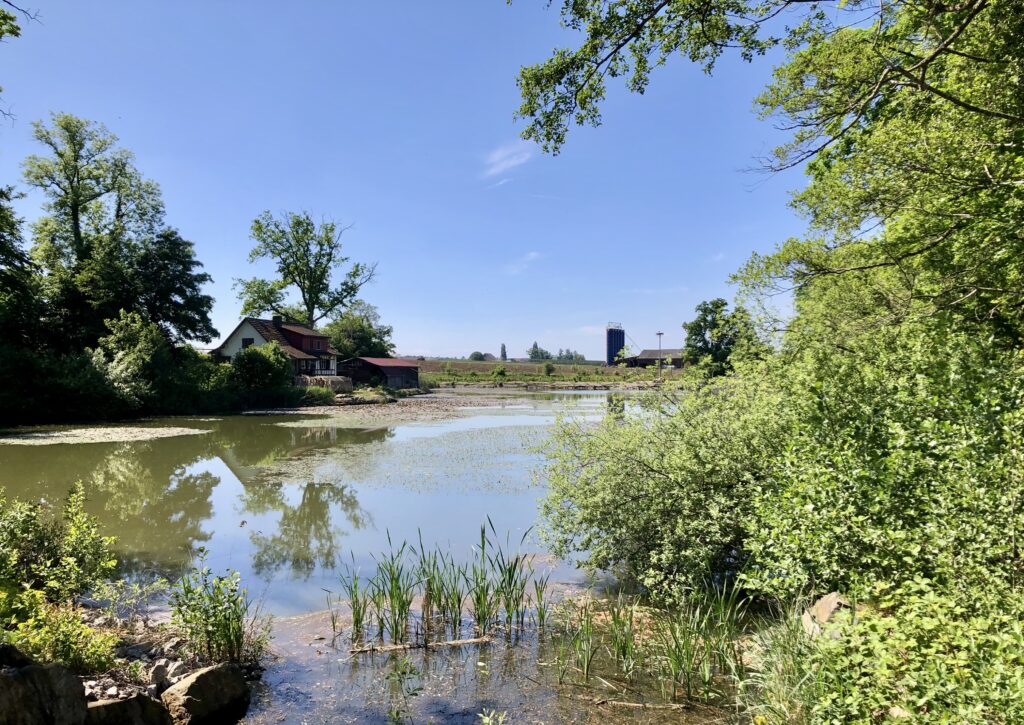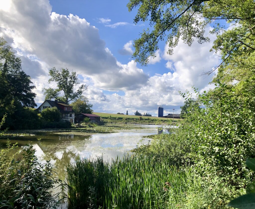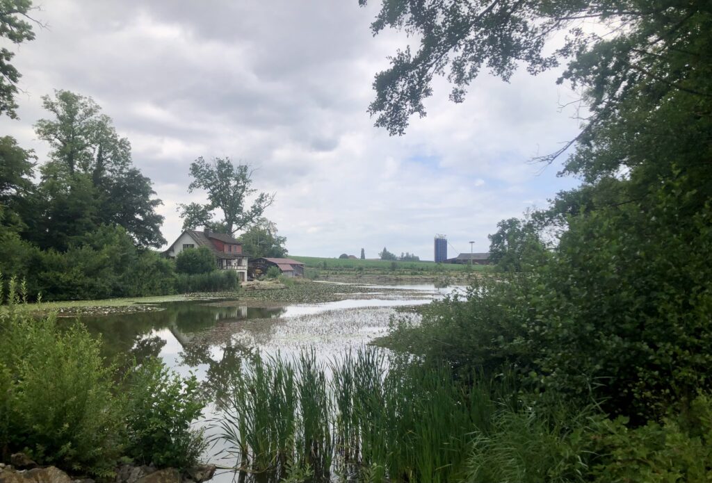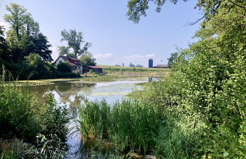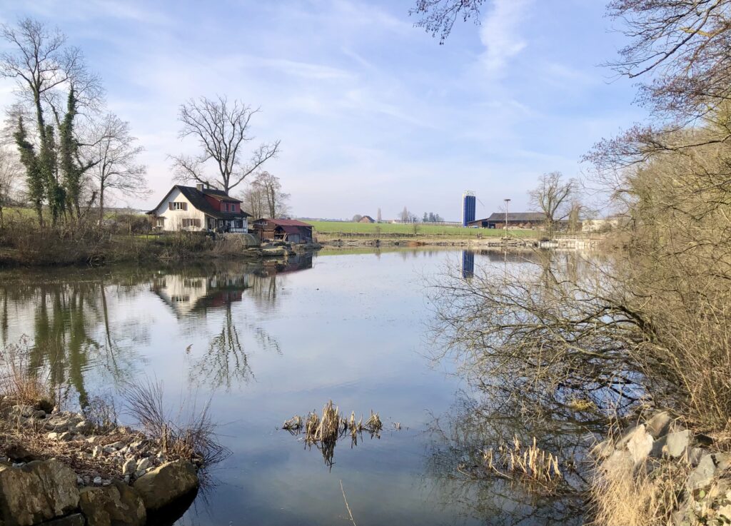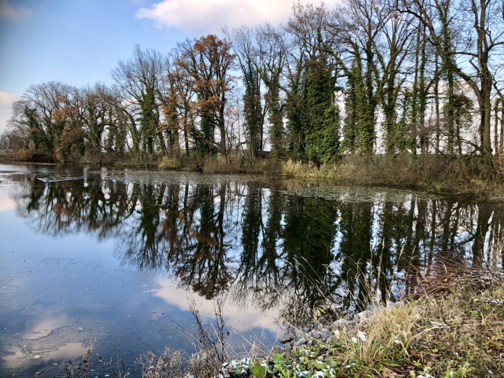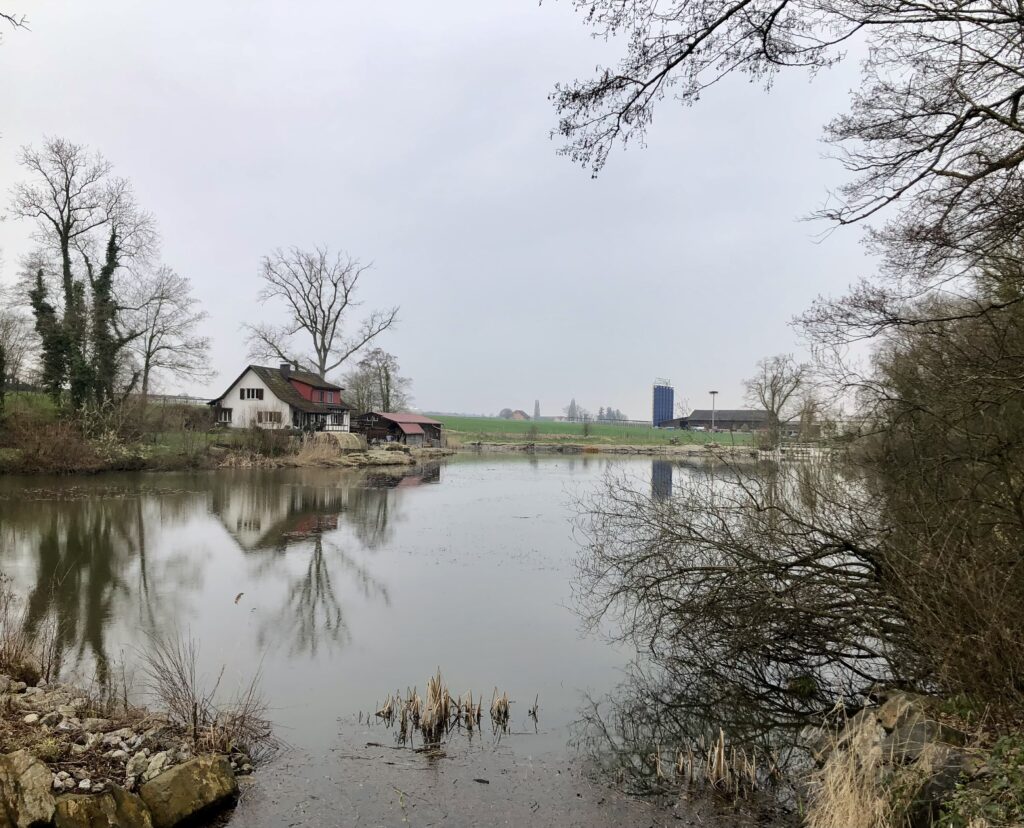 Noch ist die Vegetation rundherum eher kahl. Am Weiher liegt das Wasser ruhig, und die Spiegelungen der Uferbäume sind ganz klar zu erkennen. Von den Wassertieren haben wir diesmal zwar keine gesehen, dafür stehen rund um den Weiher bereits die Froschzäune. Ein sicheres Zeichen: Der Frühling nimmt Fahrt auf.