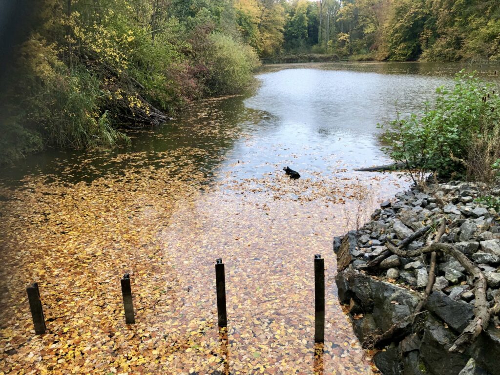 Der Laubteppich staut sich vor dem Wehr, und die Karpfen sind darunter kaum mehr zu erkennen.