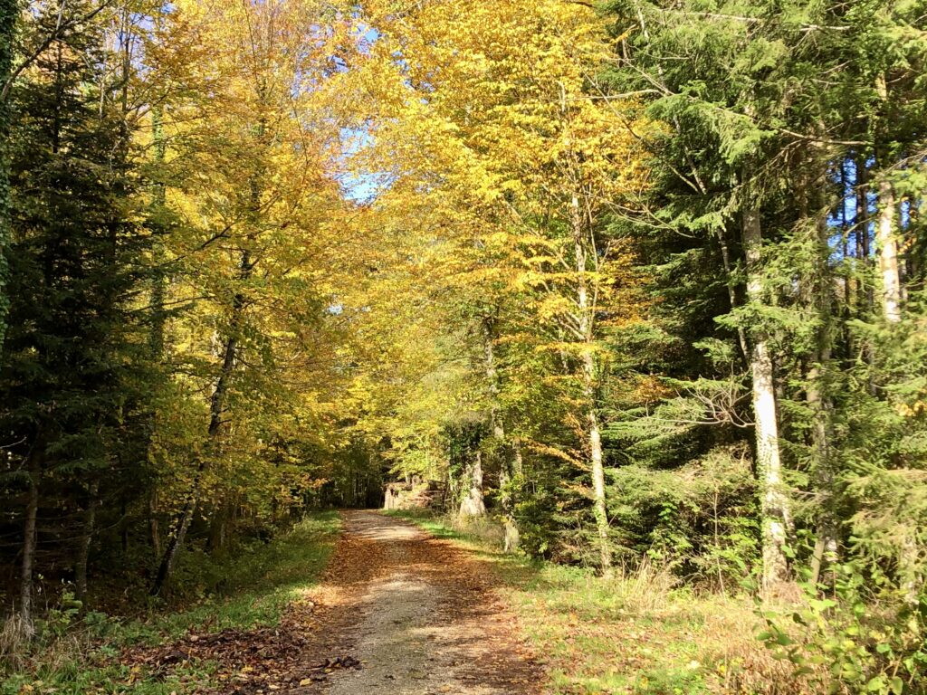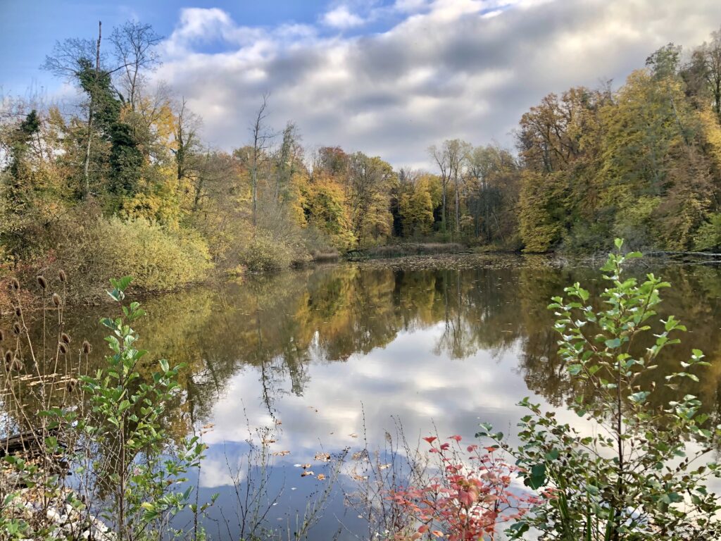 Doch auf dem Weg zum Weiher zeigt sich der goldene Oktober von seiner schönsten Seite – besonders, wenn die Sonne durch die Blätter scheint.