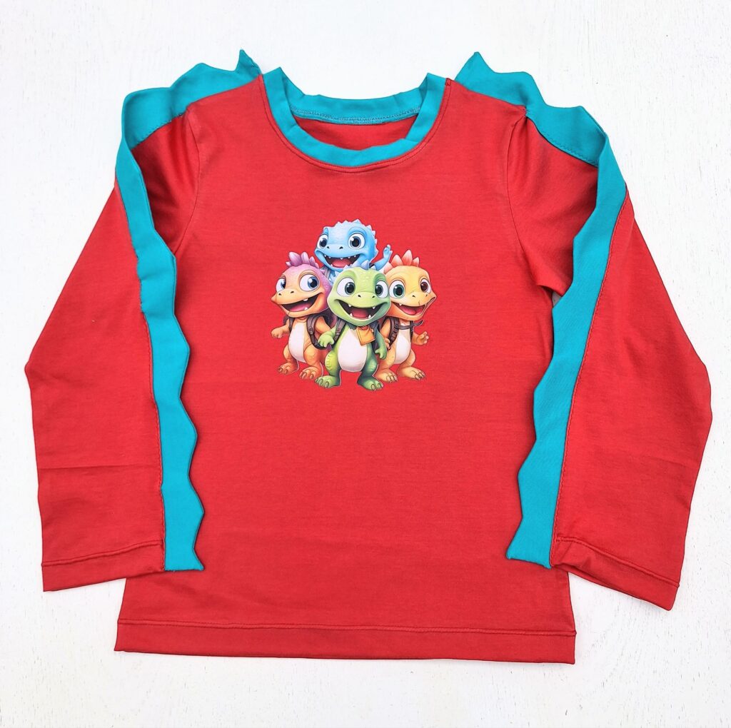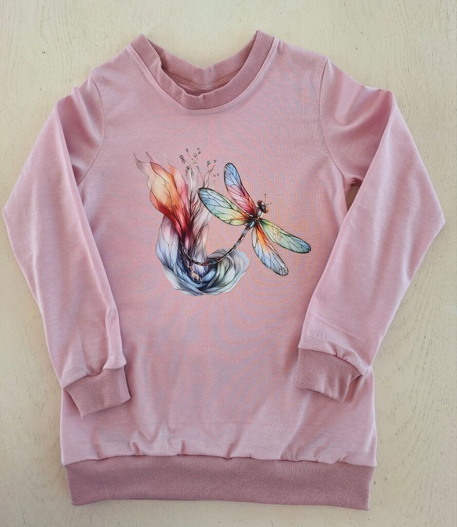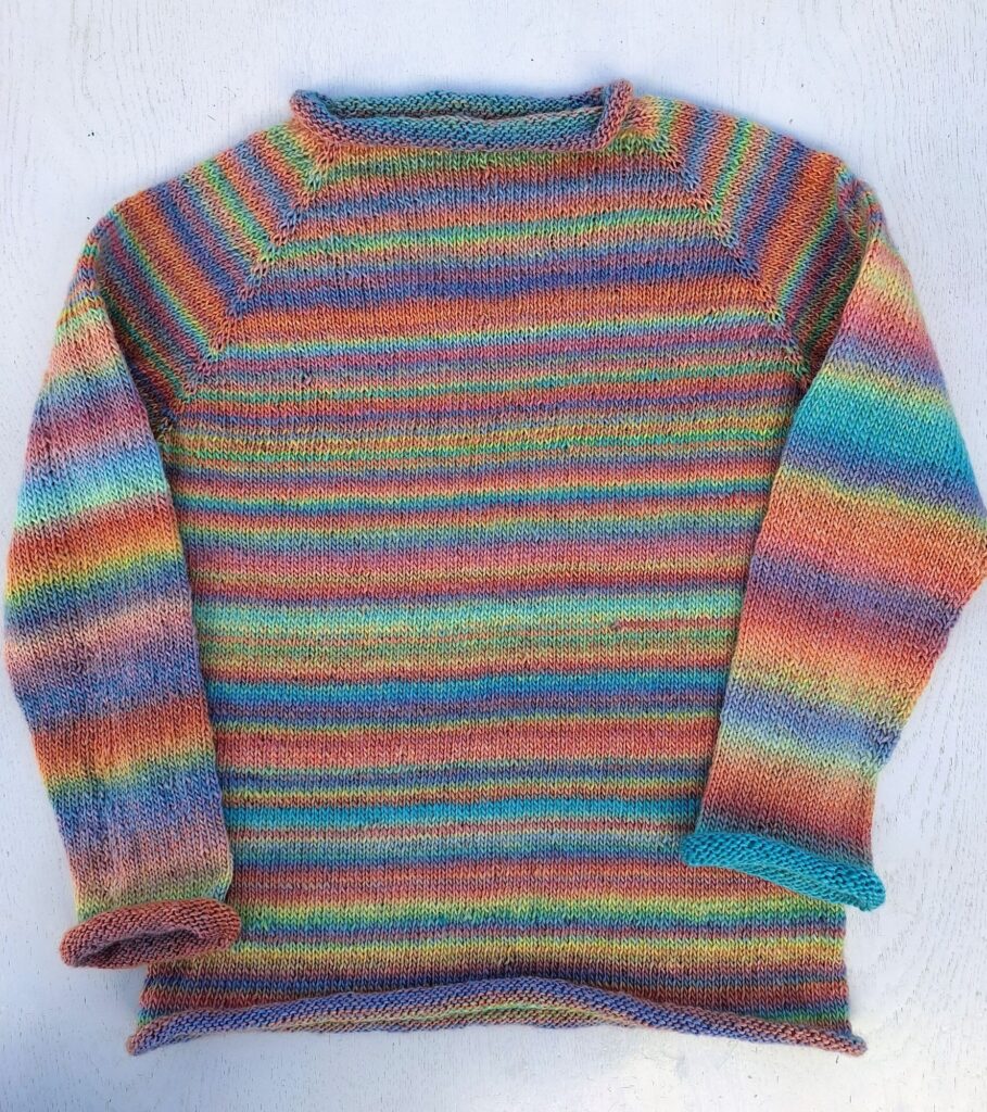 Für die kälteren Tage habe ich für die grosse Enkelin Shirts mit langen Ärmeln genäht – natürlich musste auf jedem etwas drauf sein. Und weil der erste Dinopullover so beliebt ist, wünschte sie sich einen zweiten. Ich weiss nicht mehr genau, wann ich den Pullover mit dem Verlaufsgarn angefangen habe. Da ich ihn von oben gestrickt habe, war es kein Problem, einfach noch ein paar Runden weiterzustricken, bis er gepasst hat. Also: Nähen geht eindeutig besser! Zurzeit bin ich auch fleissig am Täschchen nähen und sie werden immer schöner. Hoffentlich finden sich auch Abnehmer dafür, denn ich nähe sie für einen guten Zweck.