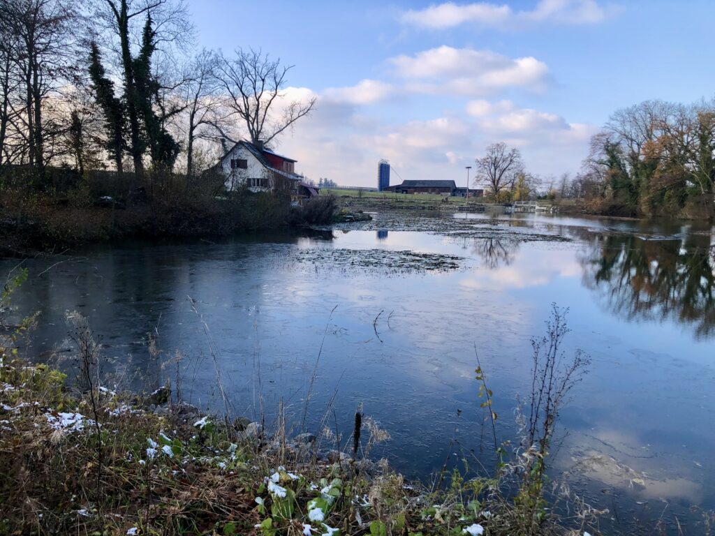 Wenn ich meine Position nur ganz leicht verändere, sieht man auf dem Bild, dass bereits eine dünne Eisschicht auf dem Weiher liegt.
