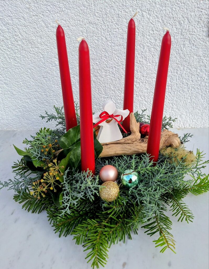 Pünktlich zum Advent habe ich für meine Liebsten Adventsgestecke gemacht, und die erste Kerze brennt auch schon. Für die Enkelinnen habe ich wieder einen traditionellen Kranz mit vier Kerzen gestaltet, damit sie die Bedeutung der vier Adventssonntage anschaulich erleben können.