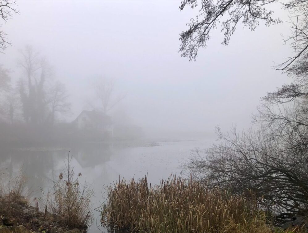 Fast den ganzen Dezember war es bei uns am See und auch an meinem Standort beim Weiher – grau. Oft wurde es den ganzen Tag nicht richtig hell. Kein Lieblingswetter von mir! Darum sieht man auf dem Foto auch nicht besonders viel. Viel lieber hätte ich euch ein Bild mit verschneiter Landschaft oder einem zugefrorenen Weiher gezeigt, so wie damals, als unsere Kinder noch klein waren und auf dem Eisfeld Schlittschuh laufen konnten.