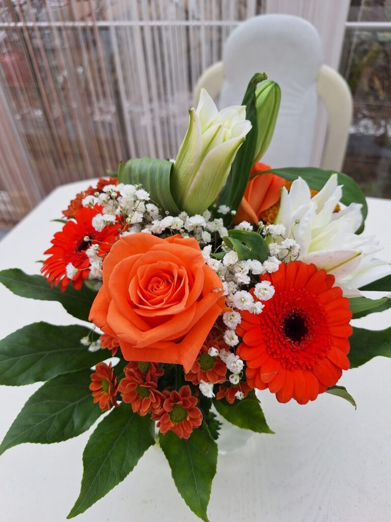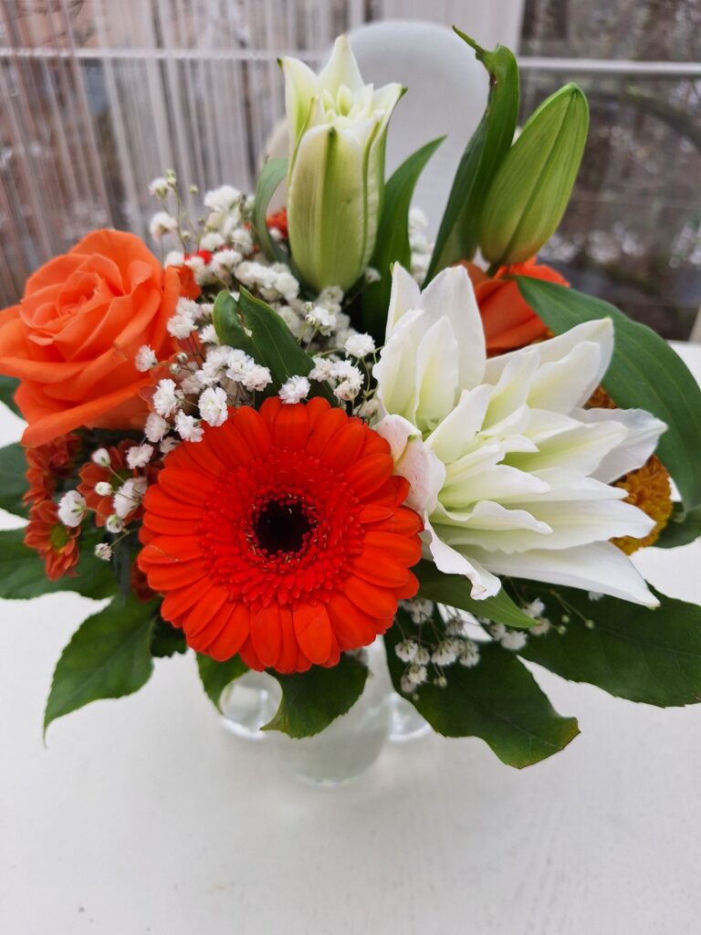 Die Blumen stehen nun schon fast zwei Wochen im Wintergarten und sehen immer noch wunderschön aus, und die weisse Lilie öffnet sich jeden Tag ein Stückchen mehr.