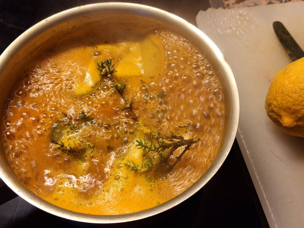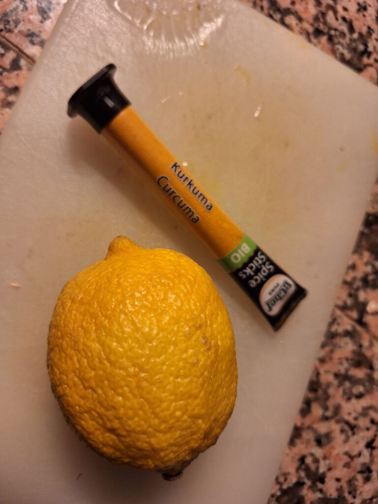 Dafür schneide ich Ingwer mit Schale klein und koche ihn zusammen mit Kurkuma, schwarzem Pfeffer und Zitrone in Wasser auf. Anschliessend lasse ich alles kurz ziehen.