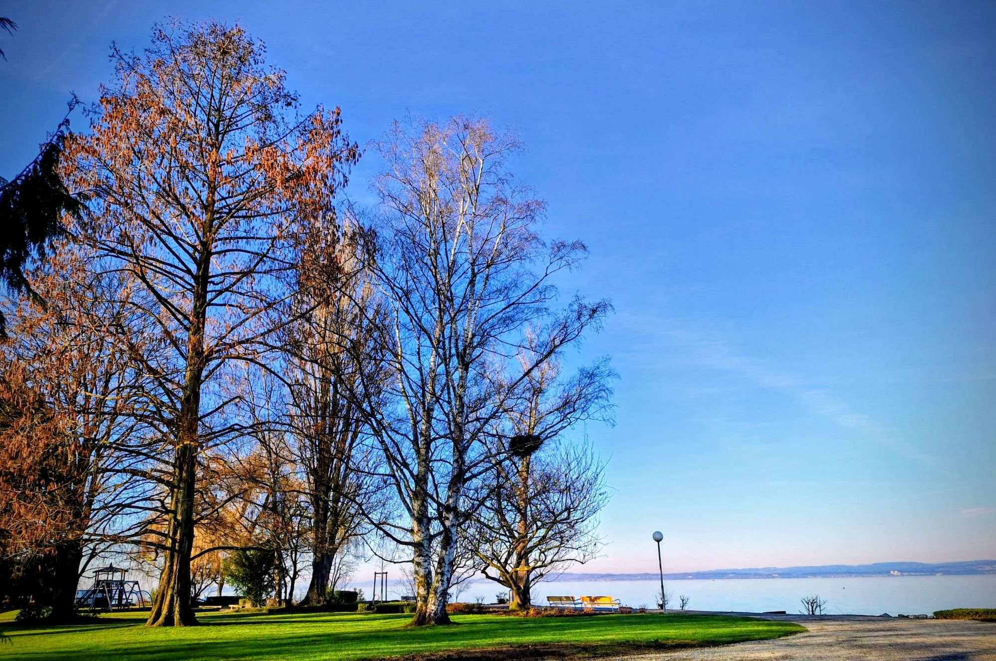 Das Laub an den Bäumen am Ufer ist inzwischen grösstenteils abgefallen, und der Himmel scheint wieder durch die kahlen Äste.