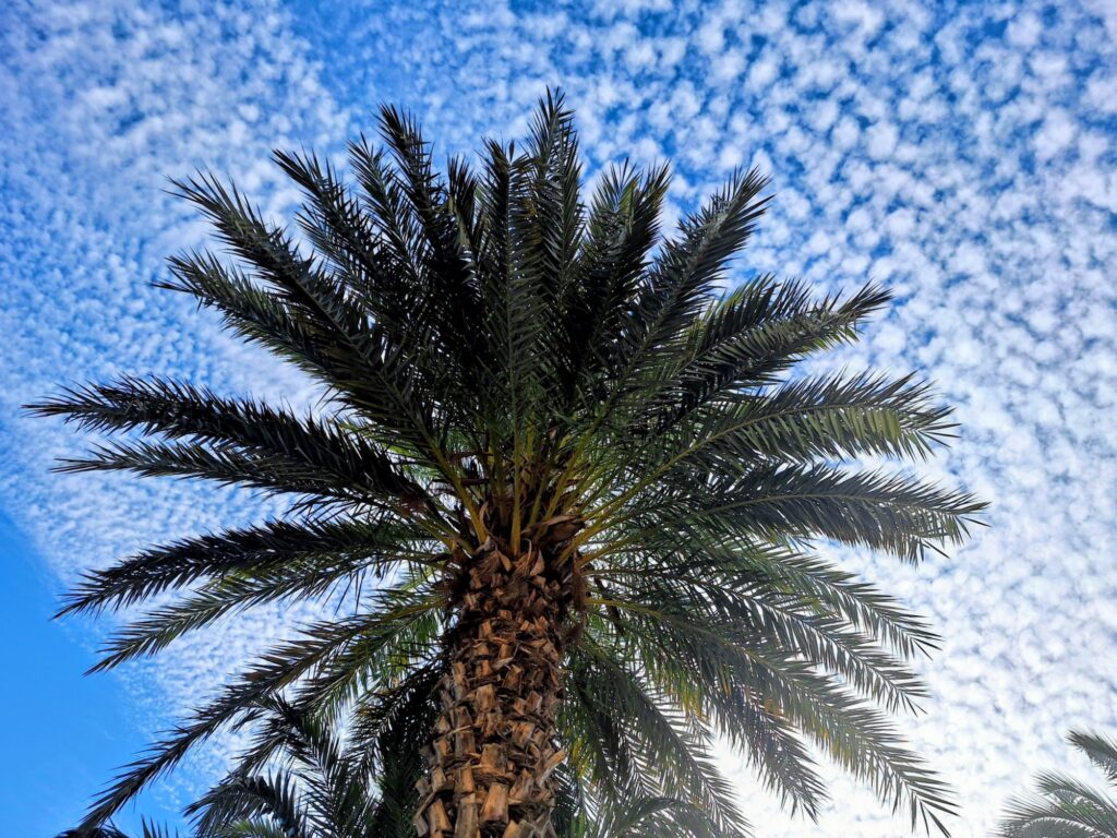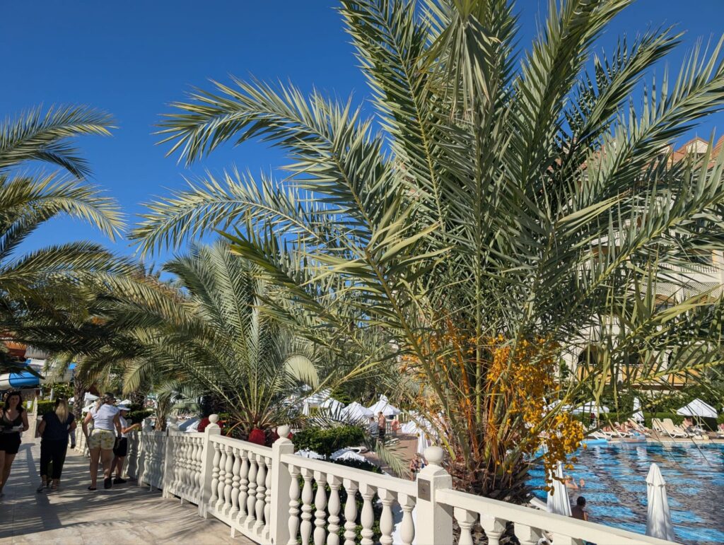 Besonders schön fand ich, dass es überall auf der Anlage schattige Plätzchen gab. Viele Palmen trugen sogar reife Datteln!