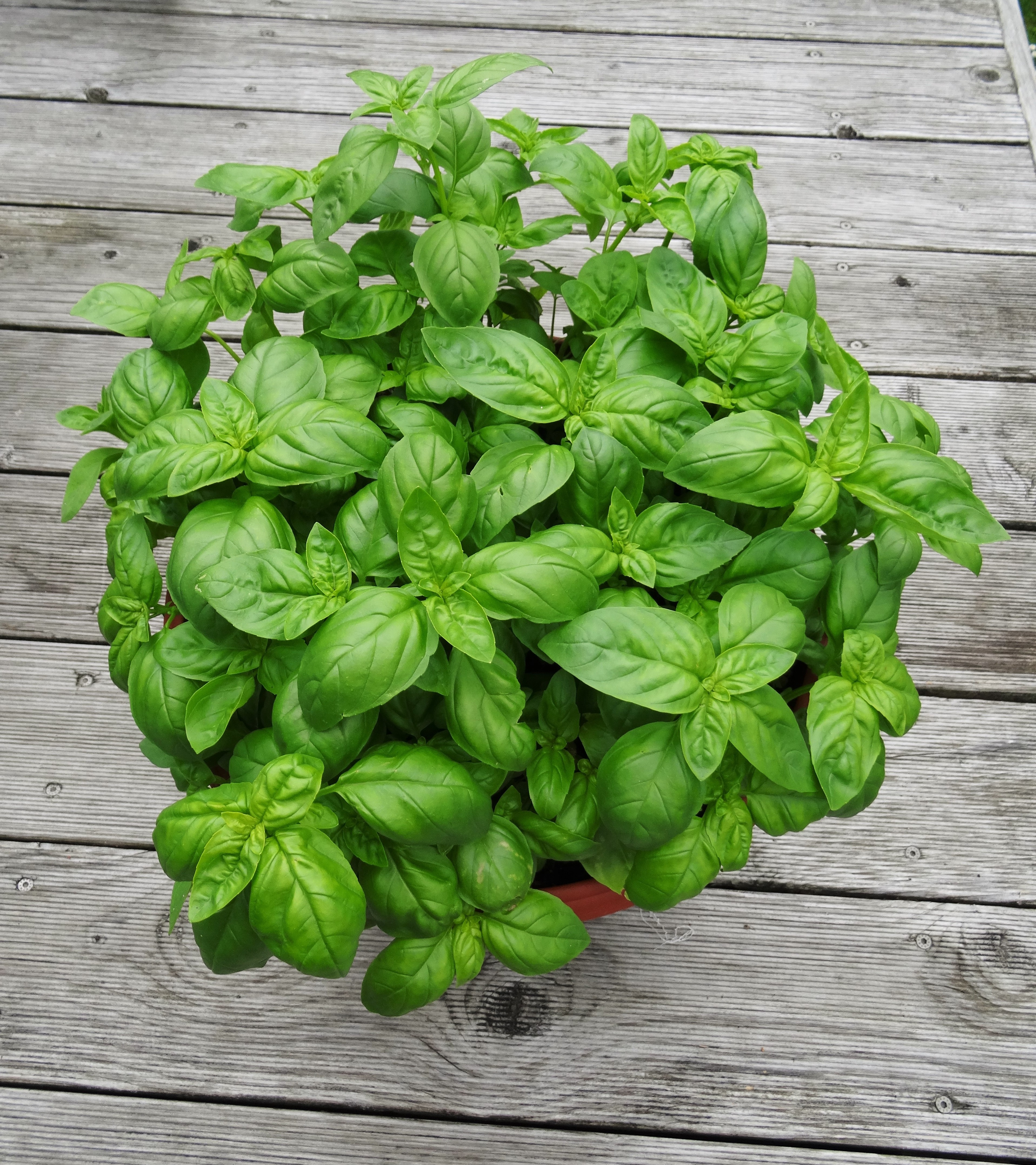Nichts einfacher als das. Einmal mit der Fotokamera um das Haus laufen und fertig. Auf der Terrasse steht z.B. mein geliebter Basilikum mit den schönen glänzenden Blätter, die wunderbar duften. Der steht immer bereit, damit man frische Blätter pflücken kann.