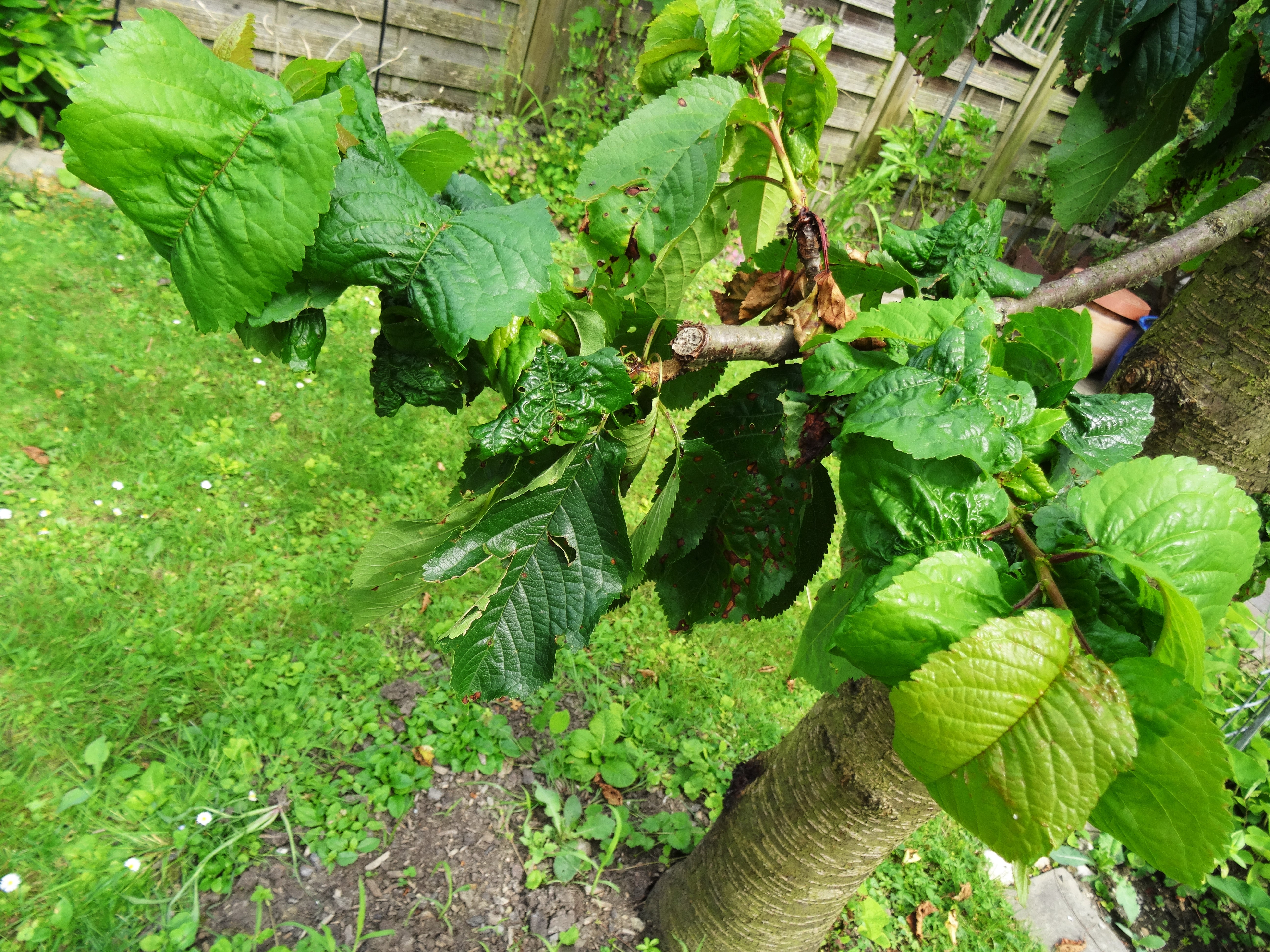 Aber auch kranke Blätter gibt es bei uns im Garten. Sehr zum Ärgernis von meinem Mann, weil ich ihm strikt verboten habe, diese mit Chemie zu behandeln. Da waren halt die Läuse und die Ameisen schneller. Mal sehen wie lange der Kirschenbaum noch dort stehen darf!