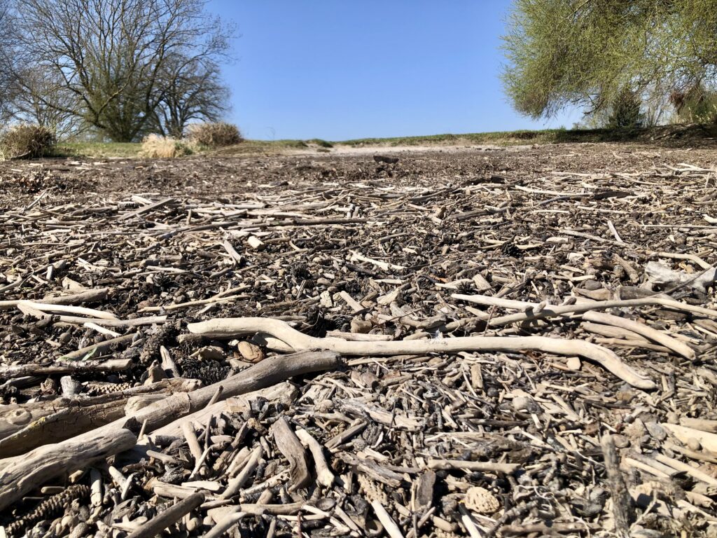 Wer erinnert sich noch daran, wie ich im Frühjahr Berge von Schwemmholz gesammelt habe? Der See hat sich inzwischen wieder gefüllt, das Wasser reicht bis ans Ufer, Schwemmholz gibt es also keines mehr.
