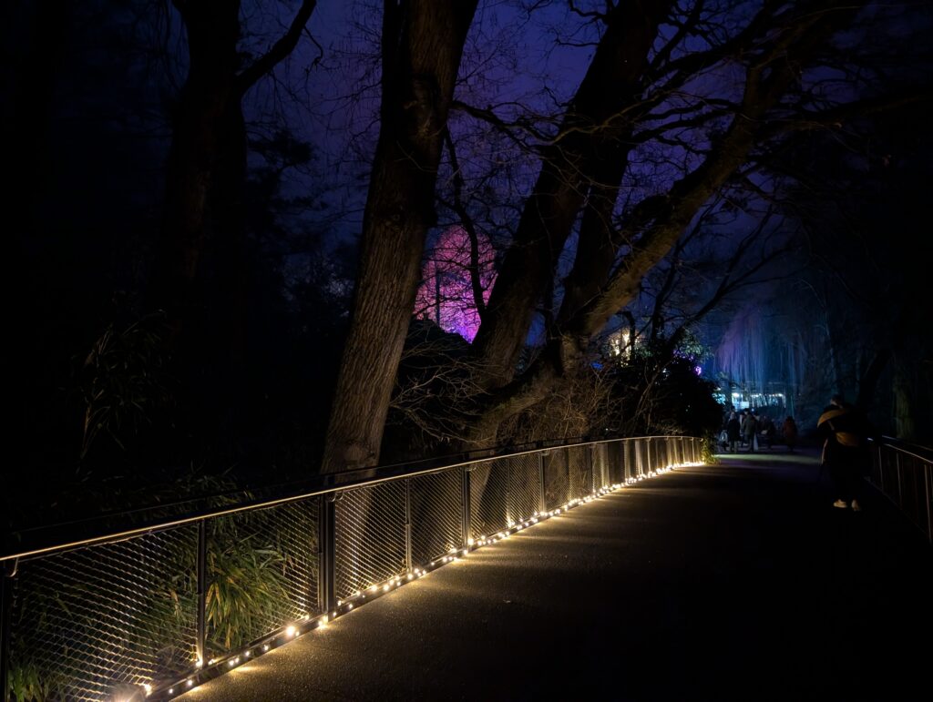 Treffpunkt für unseren gemeinsamen Abend mit unseren Töchtern war der Parkplatz bei der Insel Mainau. Die Mainau kenne ich sonst als blühende Insel im Bodensee, doch in der Advents- und Weihnachtszeit verwandelt sich der Park in ein wahres Lichtermeer. Schon auf dem Weg über die Brücke leuchteten uns unzählige Farben entgegen und stimmten uns auf das ein, was uns erwartete.